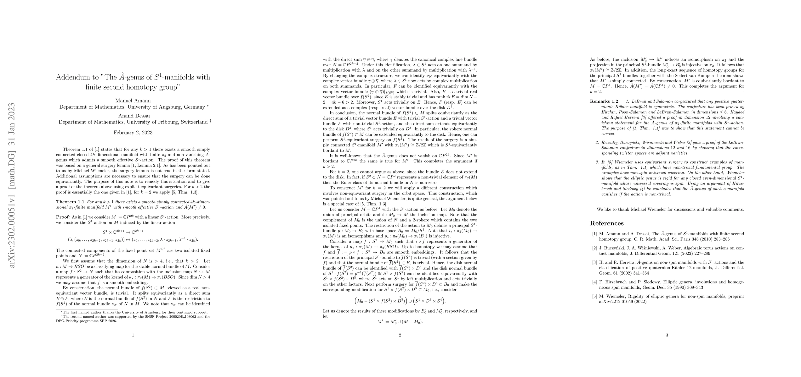 In C. R. Math. Acad. Sci. Paris 348 (2010) pp. 283--285 (arXiv:0811.0840) we constructed examples of $S^1$-manifolds with finite second homotopy group and non-vanishing $\hat A$-genus. The reasoning was based on an equivariant surgery lemma which only holds under additional assumptions. To remedy the situation we give a construction using explicit equivariant surgeries.