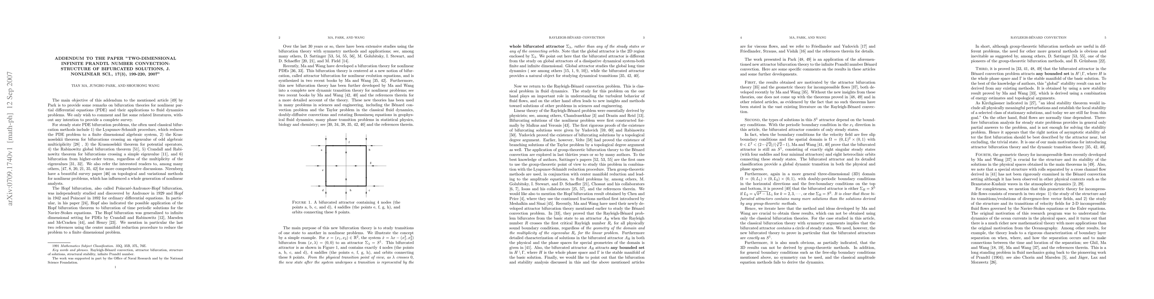 The main objective of this addendum to the mentioned article by Park is to provide some remarks on bifurcation theories for nonlinear partial differential equations (PDE) and their applications to fluid dynamics problems. We only wish to comment and list some related literatures, without any intention to provide a complete survey.