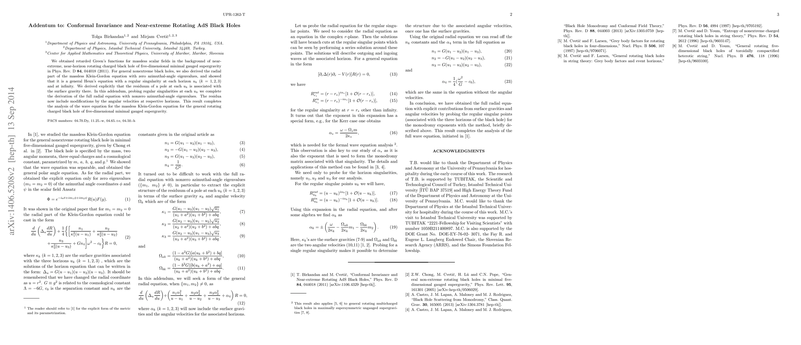 We obtained retarded Green's functions for massless scalar fields in the background of near-extreme, near-horizon rotating charged black hole of five-dimensional minimal gauged supergravity in Phys. Rev. D84, 044018 (2011). For general nonextreme black holes, we also derived the radial part of the massless Klein-Gordon equation with zero azimuthal-angle eigenvalues, and showed that it is a general Heun's equation with a regular singularity at each horizon $u_k$ ($k=1,2,3$) and at infinity. We derived explicitly that the residuum of a pole at each $u_k$ is associated with the surface gravity there. In this addendum, probing regular singularities at each $u_k$ we complete the derivation of the full radial equation with nonzero azimuthal-angle eigenvalues. The residua now include modifications by the angular velocities at respective horizons. This result completes the analysis of the wave equation for the massless Klein-Gordon equation for the general rotating charged black hole of five-dimensional minimal gauged supergravity.