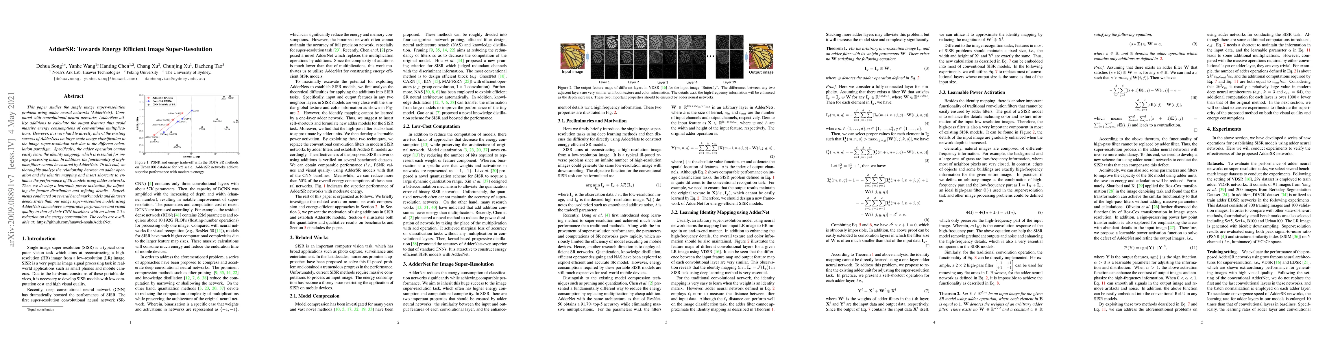 This paper studies the single image super-resolution problem using adder neural networks (AdderNet). Compared with convolutional neural networks, AdderNet utilizing additions to calculate the output features thus avoid massive energy consumptions of conventional multiplications. However, it is very hard to directly inherit the existing success of AdderNet on large-scale image classification to the image super-resolution task due to the different calculation paradigm. Specifically, the adder operation cannot easily learn the identity mapping, which is essential for image processing tasks. In addition, the functionality of high-pass filters cannot be ensured by AdderNet. To this end, we thoroughly analyze the relationship between an adder operation and the identity mapping and insert shortcuts to enhance the performance of SR models using adder networks. Then, we develop a learnable power activation for adjusting the feature distribution and refining details. Experiments conducted on several benchmark models and datasets demonstrate that, our image super-resolution models using AdderNet can achieve comparable performance and visual quality to that of their CNN baselines with an about 2$\times$ reduction on the energy consumption.