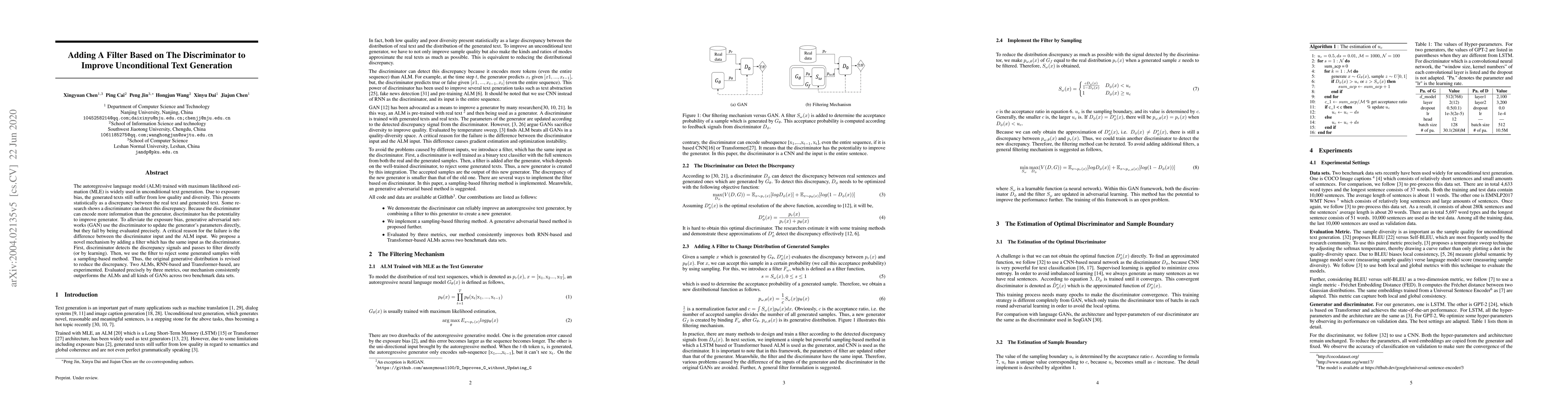 The autoregressive language model (ALM) trained with maximum likelihood estimation (MLE) is widely used in unconditional text generation. Due to exposure bias, the generated texts still suffer from low quality and diversity. This presents statistically as a discrepancy between the real text and generated text. Some research shows a discriminator can detect this discrepancy. Because the discriminator can encode more information than the generator, discriminator has the potentiality to improve generator. To alleviate the exposure bias, generative adversarial networks (GAN) use the discriminator to update the generator's parameters directly, but they fail by being evaluated precisely. A critical reason for the failure is the difference between the discriminator input and the ALM input. We propose a novel mechanism by adding a filter which has the same input as the discriminator. First, discriminator detects the discrepancy signals and passes to filter directly (or by learning). Then, we use the filter to reject some generated samples with a sampling-based method. Thus, the original generative distribution is revised to reduce the discrepancy. Two ALMs, RNN-based and Transformer-based, are experimented. Evaluated precisely by three metrics, our mechanism consistently outperforms the ALMs and all kinds of GANs across two benchmark data sets.