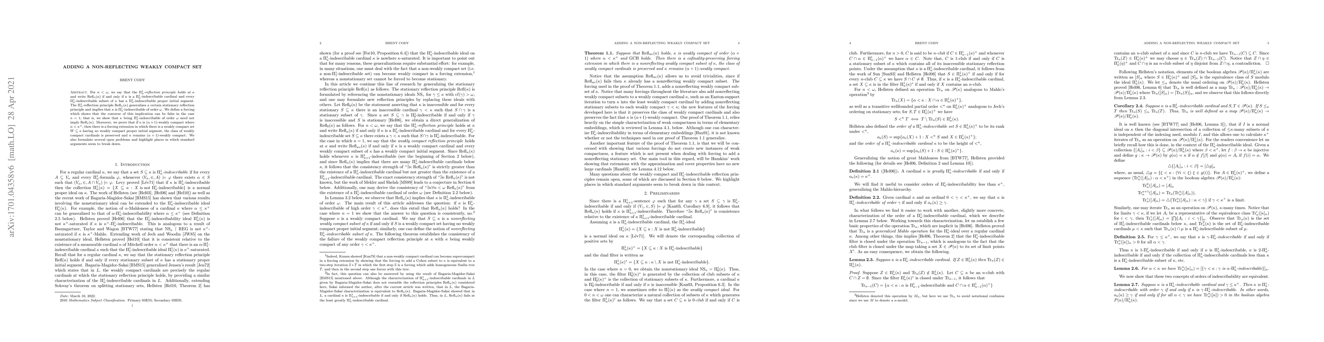 For $n<\omega$, we say that the $\Pi^1_n$-reflection principle holds at $\kappa$ and write $\text{Refl}_n(\kappa)$ if and only if $\kappa$ is a $\Pi^1_n$-indescribable cardinal and every $\Pi^1_n$-indescribable subset of $\kappa$ has a $\Pi^1_n$-indescribable proper initial segment. The $\Pi^1_n$-reflection principle $\text{Refl}_n(\kappa)$ generalizes a certain stationary reflection principle and implies that $\kappa$ is $\Pi^1_n$-indescribable of order $\omega$. We define a forcing which shows that the converse of this implication can be false in the case $n=1$. Moreover, we prove that if $\kappa$ is $(\alpha+1)$-weakly compact where $\alpha<\kappa^+$, then there is a forcing extension in which there is a weakly compact set $W\subseteq\kappa$ having no weakly compact proper initial segment, the class of weakly compact cardinals is preserved and $\kappa$ remains $(\alpha+1)$-weakly compact. Additionally, we prove a resurrection result for the $\Pi^1_1$-reflection principle.