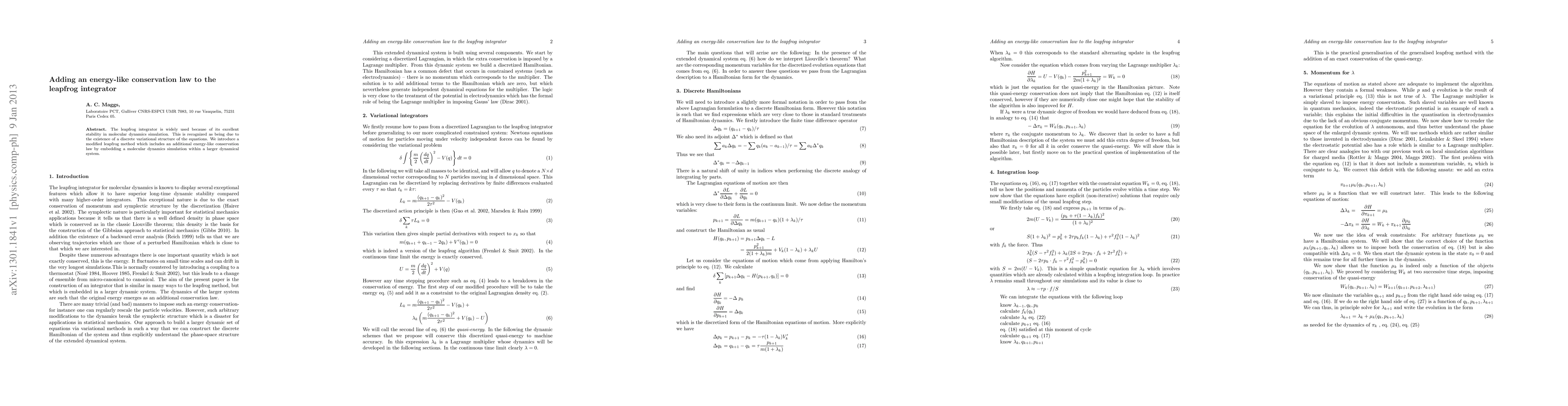 This paper proposes a modified version of the leapfrog integrator that incorporates an additional energy-like conservation law, enhancing its stability in molecular dynamics simulations by embedding the simulation within a larger dynamical system. The new method aims to improve the accuracy and reliability of simulations.