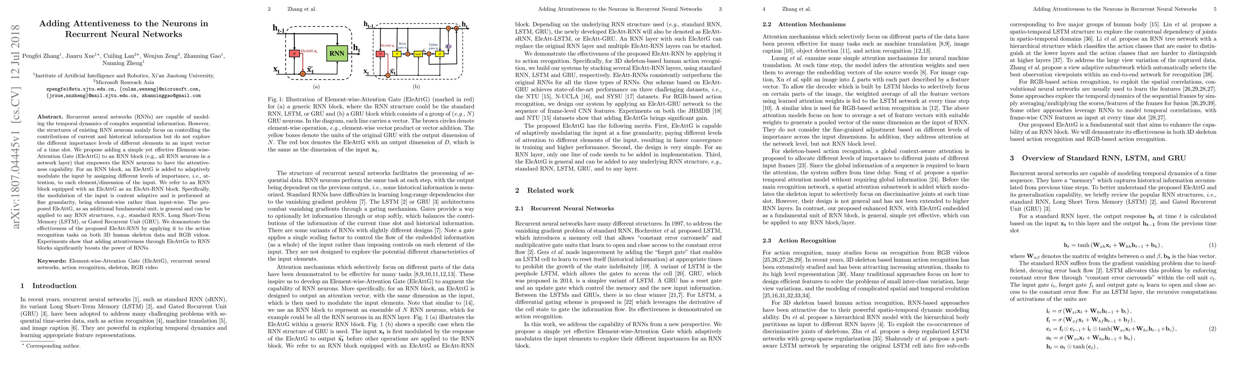 This paper proposes an Element-wise Attention Gate (EleAttG) to enhance RNN neurons' ability to focus on important elements in input vectors, termed EleAtt-RNN blocks. Experiments show that this attention mechanism significantly improves action recognition performance on both 3D skeleton data and RGB videos.