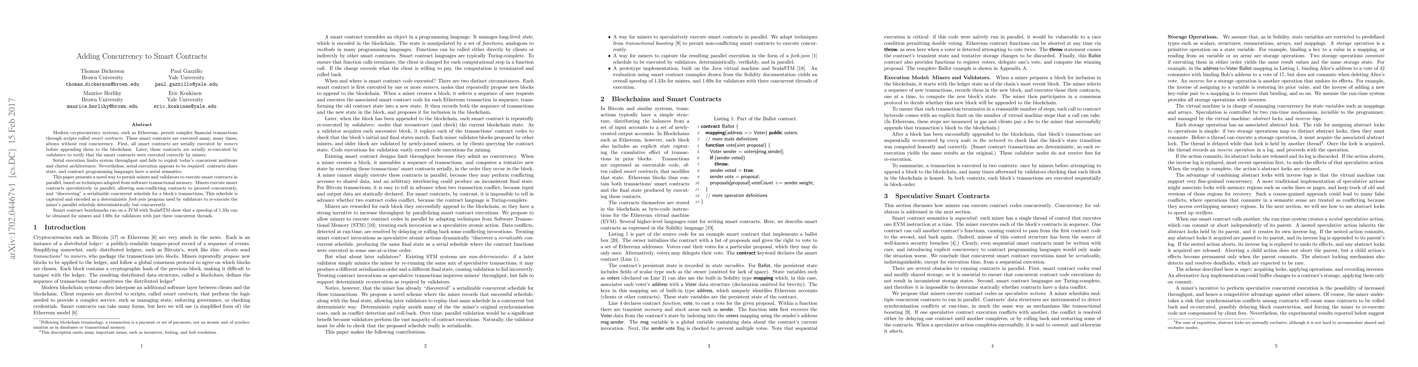 This paper proposes a method to enable parallel execution of smart contracts in Ethereum using techniques from software transactional memory, allowing miners and validators to run contracts concurrently and improving system throughput. Benchmarks demonstrate a speedup of 1.33x for miners and 1.69x for validators with just three concurrent threads.