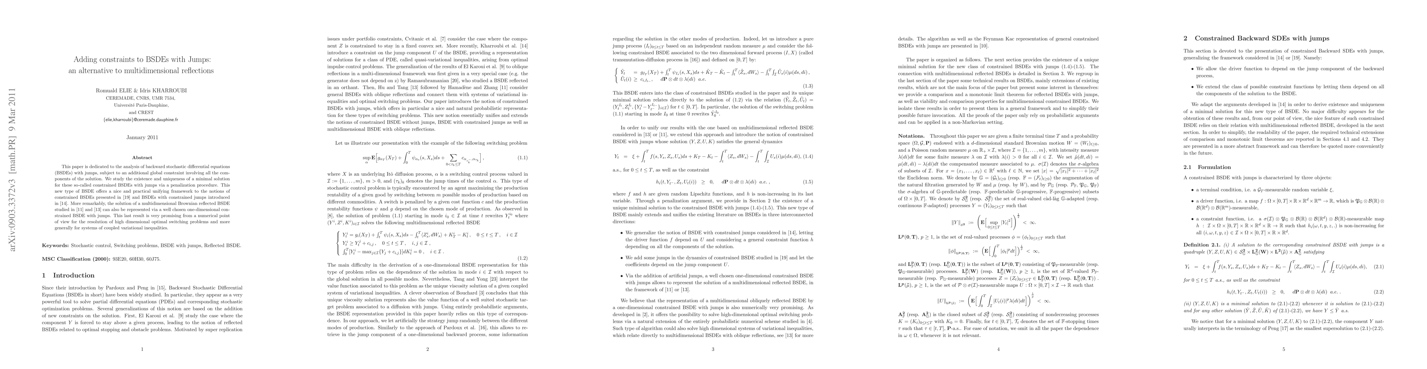 This paper explores the existence and uniqueness of minimal solutions for constrained backward stochastic differential equations (BSDEs) with jumps, employing a penalization method. It provides a unifying framework for various constrained BSDE concepts and shows that high-dimensional reflected BSDEs can be represented via simpler, one-dimensional constrained BSDEs, promising improved numerical resolution for complex optimal switching problems.