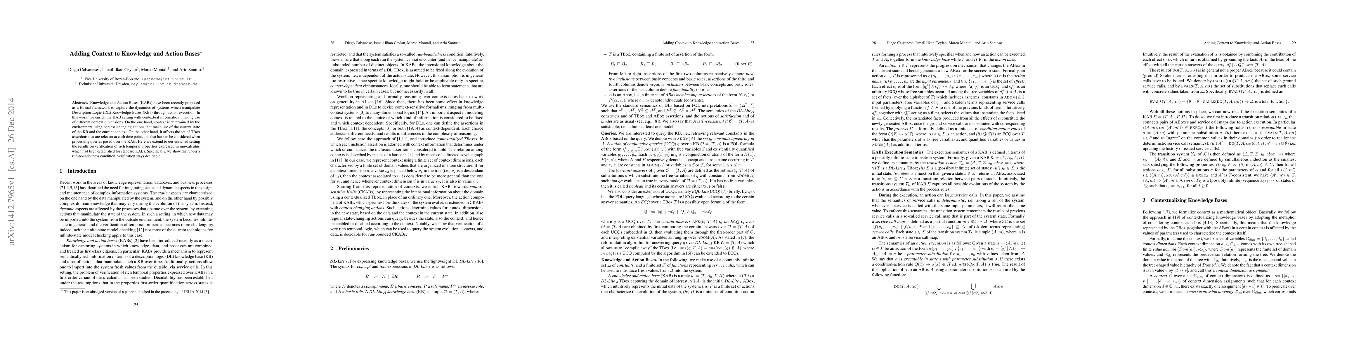 This paper enriches the Knowledge and Action Bases (KAB) framework by incorporating contextual information across various dimensions, affecting both environment-driven context changes and the relevance of TBox assertions. It demonstrates that verification of temporal properties remains decidable under a run-boundedness condition.