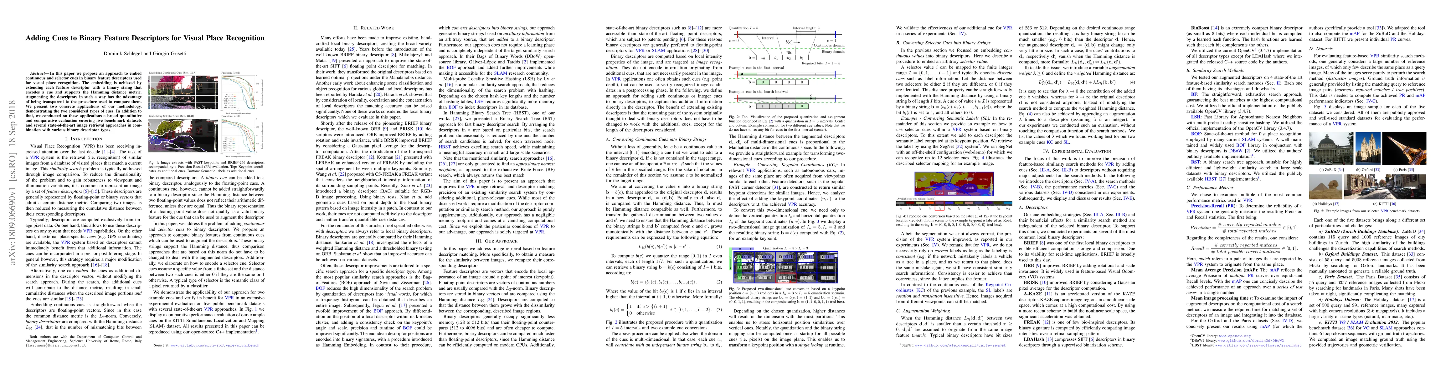 In this paper we propose an approach to embed continuous and selector cues in binary feature descriptors used for visual place recognition. The embedding is achieved by extending each feature descriptor with a binary string that encodes a cue and supports the Hamming distance metric. Augmenting the descriptors in such a way has the advantage of being transparent to the procedure used to compare them. We present two concrete applications of our methodology, demonstrating the two considered types of cues. In addition to that, we conducted on these applications a broad quantitative and comparative evaluation covering five benchmark datasets and several state-of-the-art image retrieval approaches in combination with various binary descriptor types.