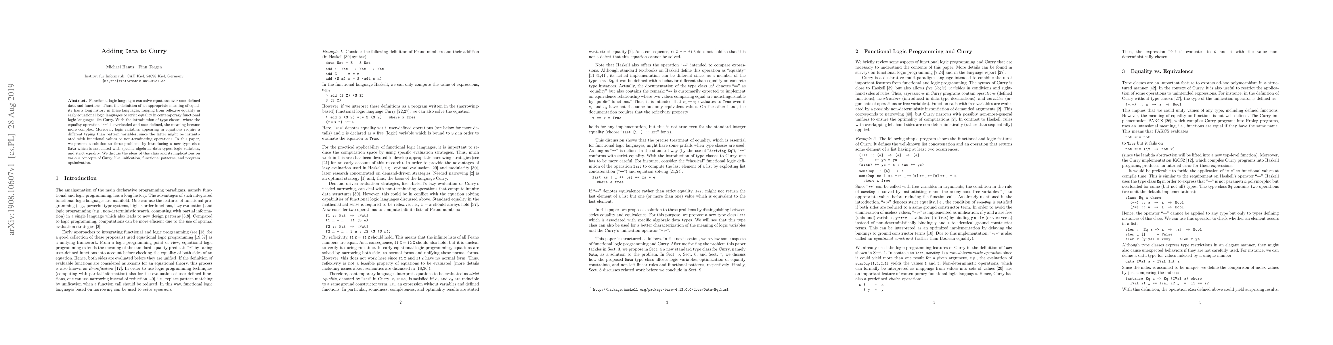 This paper introduces a new type class "Data" in Curry to manage complex equality definitions involving user-defined data types and logic variables. It addresses the challenges of overloading the equality operation and distinguishes between logic and pattern variables, enhancing unification, functional patterns, and program optimization.
