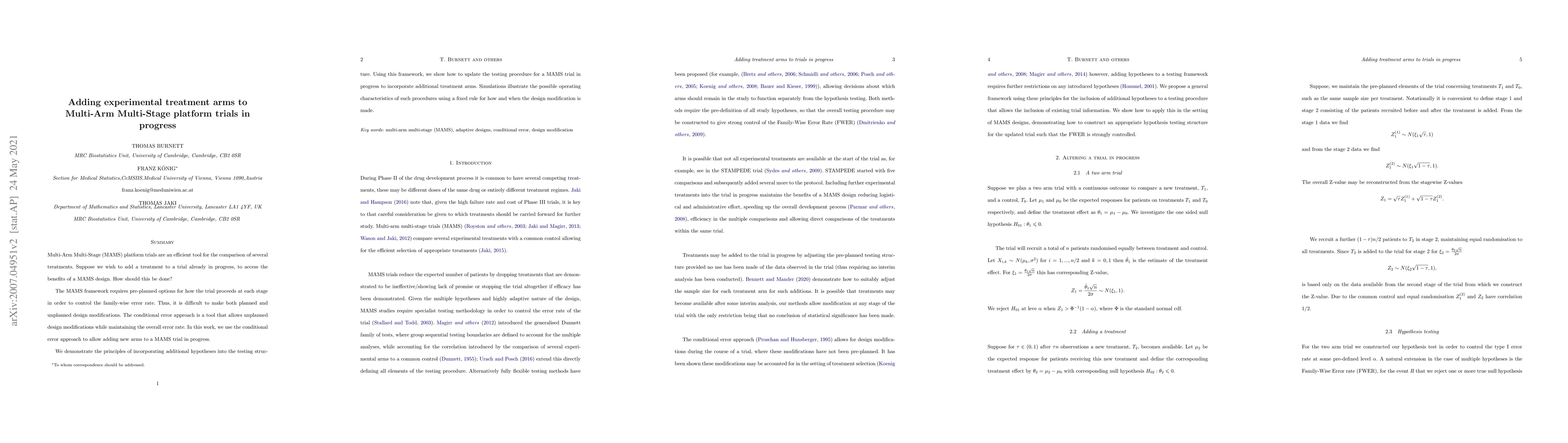 This paper explores methods for adding new treatment arms to ongoing Multi-Arm Multi-Stage (MAMS) platform trials. It proposes the conditional error approach to allow such modifications while maintaining the overall error rate, demonstrating the principles and updating procedures through simulations.