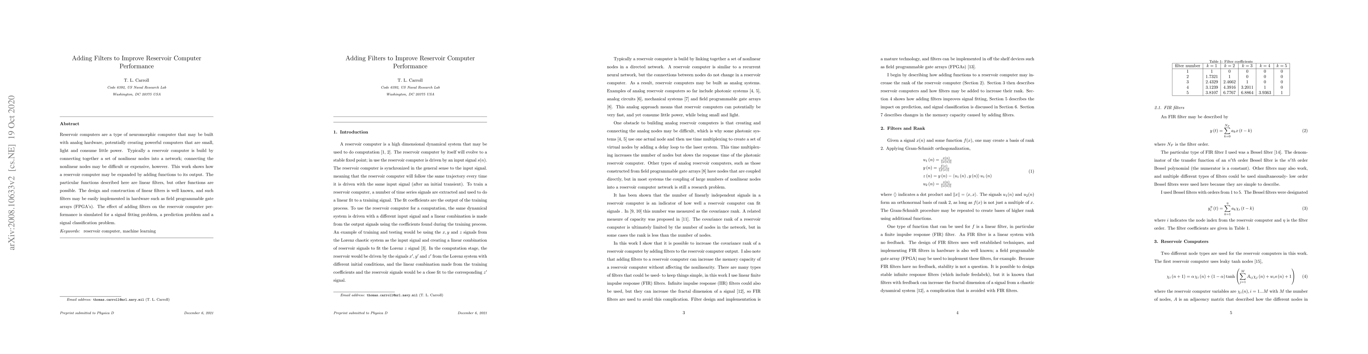 Reservoir computers are a type of neuromorphic computer that may be built a an analog system, potentially creating powerful computers that are small, light and consume little power. Typically a reservoir computer is build by connecting together a set of nonlinear nodes into a network; connecting the nonlinear nodes may be difficult or expensive, however. This work shows how a reservoir computer may be expanded by adding functions to its output. The particular functions described here are linear filters, but other functions are possible. The design and construction of linear filters is well known, and such filters may be easily implemented in hardware such as field programmable gate arrays (FPGA's). The effect of adding filters on the reservoir computer performance is simulated for a signal fitting problem, a prediction problem and a signal classification problem.