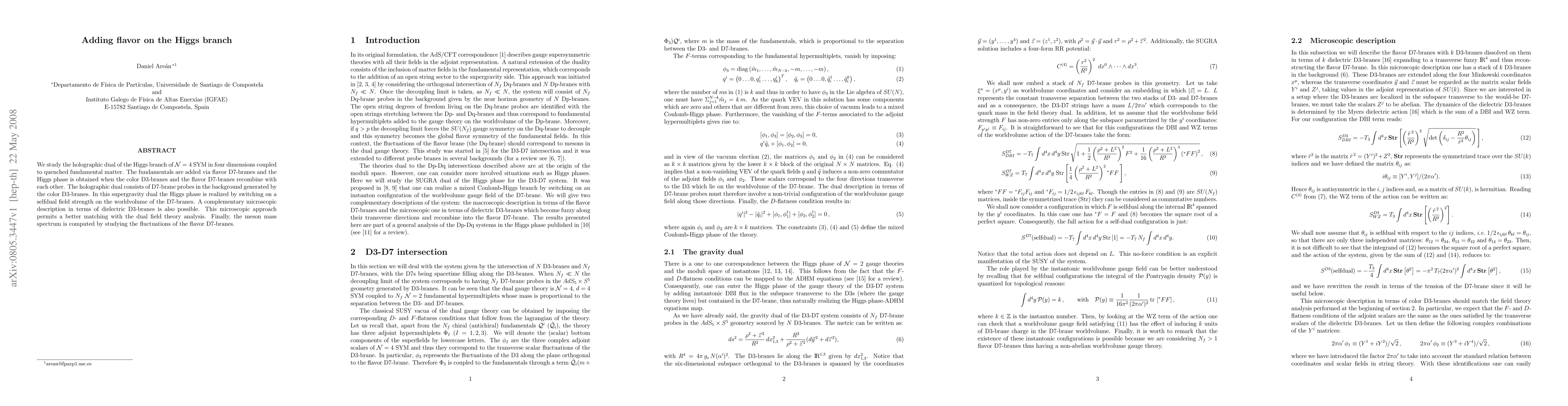 This paper explores the holographic dual of the Higgs branch in N=4 SYM theory with added fundamental matter via flavor D7-branes, revealing the Higgs phase through the recombination of D3-branes and D7-branes. The study employs both supergravity and dielectric D3-brane approaches for a comprehensive analysis, culminating in the computation of the meson mass spectrum.