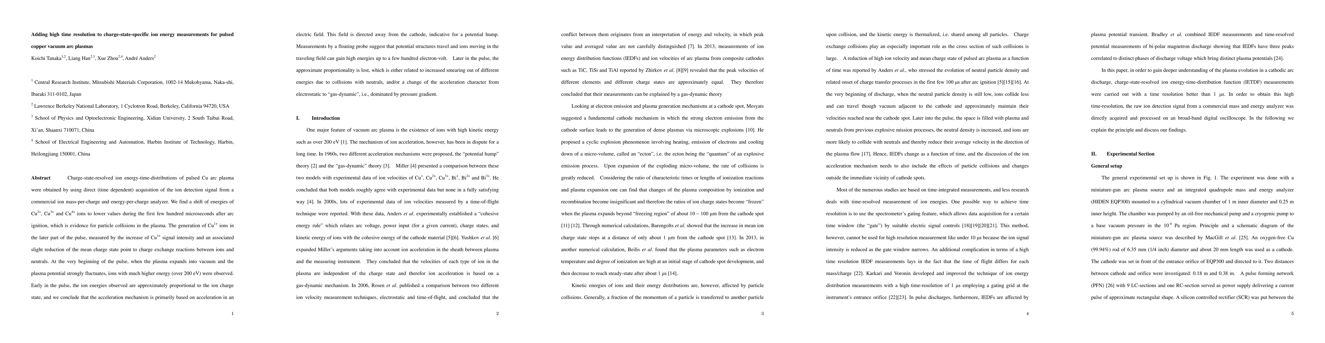 Charge-state-resolved ion energy-time-distributions of pulsed Cu arc plasma were obtained by using direct (time dependent) acquisition of the ion detection signal from a commercial ion mass-per-charge and energy-per-charge analyzer. We find a shift of energies of Cu2+, Cu3+ and Cu4+ ions to lower values during the first few hundred microseconds after arc ignition, which is evidence for particle collisions in the plasma. The generation of Cu1+ ions in the later part of the pulse, measured by the increase of Cu1+ signal intensity and an associated slight reduction of the mean charge state point to charge exchange reactions between ions and neutrals. At the very beginning of the pulse, when the plasma expands into vacuum and the plasma potential strongly fluctuates, ions with much higher energy (over 200 eV) were observed. Early in the pulse, the ion energies observed are approximately proportional to the ion charge state, and we conclude that the acceleration mechanism is primarily based on acceleration in an electric field. This field is directed away from the cathode, indicative for a potential hump. Measurements by a floating probe suggest that potential structures travel and ions moving in the traveling field can gain high energies up to a few hundred electron-volt. Later in the pulse, the approximate proportionality is lost, which is either related to increased smearing out of different energies due to collisions with neutrals, and/or a change of the acceleration character from electrostatic to "gas-dynamic", i.e., dominated by pressure gradient.