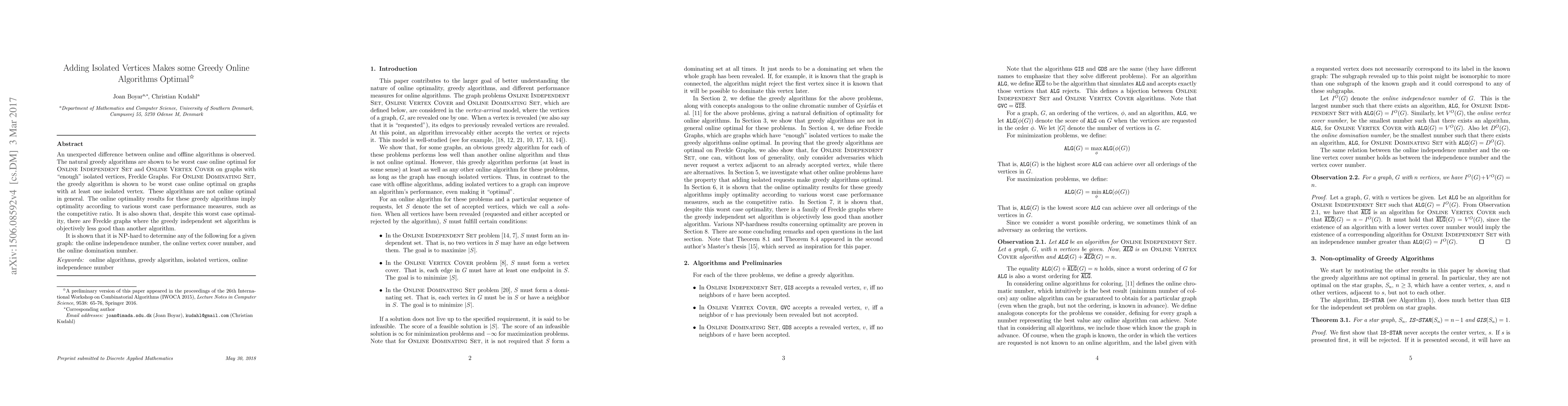 An unexpected difference between online and offline algorithms is observed. The natural greedy algorithms are shown to be worst case online optimal for Online Independent Set and Online Vertex Cover on graphs with 'enough' isolated vertices, Freckle Graphs. For Online Dominating Set, the greedy algorithm is shown to be worst case online optimal on graphs with at least one isolated vertex. These algorithms are not online optimal in general. The online optimality results for these greedy algorithms imply optimality according to various worst case performance measures, such as the competitive ratio. It is also shown that, despite this worst case optimality, there are Freckle graphs where the greedy independent set algorithm is objectively less good than another algorithm. It is shown that it is NP-hard to determine any of the following for a given graph: the online independence number, the online vertex cover number, and the online domination number.