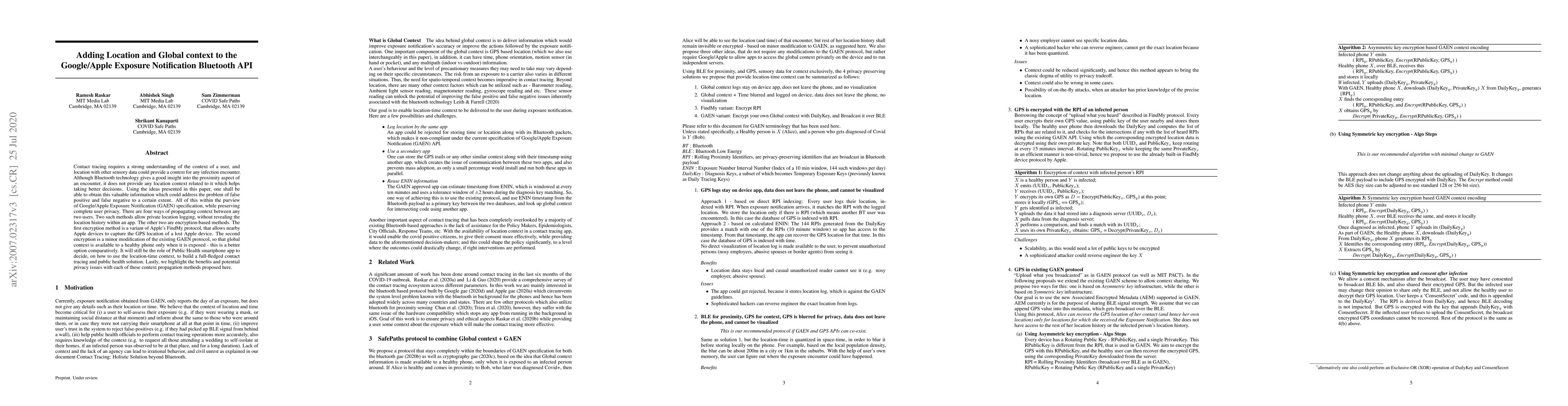 Contact tracing requires a strong understanding of the context of a user, and location with other sensory data could provide a context for any infection encounter. Although Bluetooth technology gives a good insight into the proximity aspect of an encounter, it does not provide any location context related to it which helps to make better decisions. Using the ideas presented in this paper, one shall be able to obtain this valuable information that could address the problem of false-positive and false-negative to a certain extent. All of this within the purview of Google/Apple Exposure Notification (GAEN) specification, while preserving complete user privacy. There are four ways of propagating context between any two users. Two such methods allow private location logging, without revealing the location history within an app. The other two are encryption-based methods. The first encryption method is a variant of Apple's FindMy protocol, that allows nearby Apple devices to capture the GPS location of a lost Apple device. The second encryption is a minor modification of the existing GAEN protocol so that global context is available to a healthy phone only when it is exposed - this is a better option comparatively. It will still be the role of Public Health smartphone app to decide, on how to use the location-time context, to build a full-fledged contact tracing and public health solution. Lastly, we highlight the benefits and potential privacy issues with each of these context propagation methods proposed here.