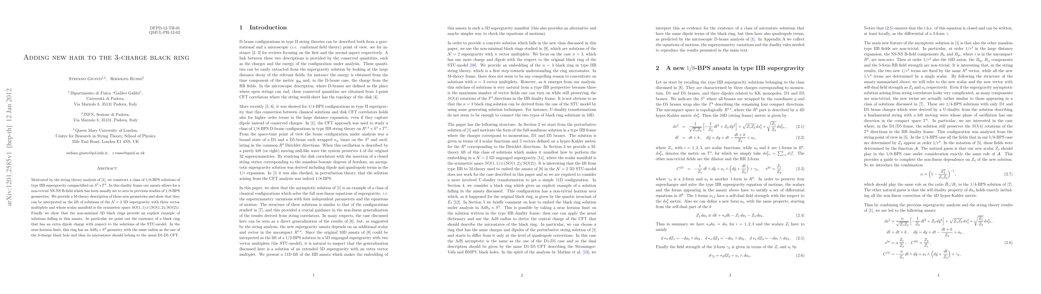 Motivated by the string theory analysis of arXiv:1108.6331, we construct a class of 1/8-BPS solutions of type IIB supergravity compactified on S^1 x T^4. In this duality frame our ansatz allows for a non-trivial NS-NS B-field which has been usually set to zero in previous studies of 1/8-BPS geometries. We provide a M-theory description of these new geometries and show that they can be interpreted as the lift of solutions of the N=2 5D supergravity with three vector multiplets and whose scalar manifold is the symmetric space SO(1,1) x (SO(1,2)/SO(2)). Finally we show that the non-minimal 5D black rings provide an explicit example of solutions falling in this ansatz. In particular we point out the existence of a black ring that has an extra dipole charge with respect to the solutions of the STU-model. In the near-horizon limit, this ring has an AdS_3 x S^3 geometry with the same radius as the one of the 3-charge black hole and thus its microstates should belong to the usual D1-D5 CFT.