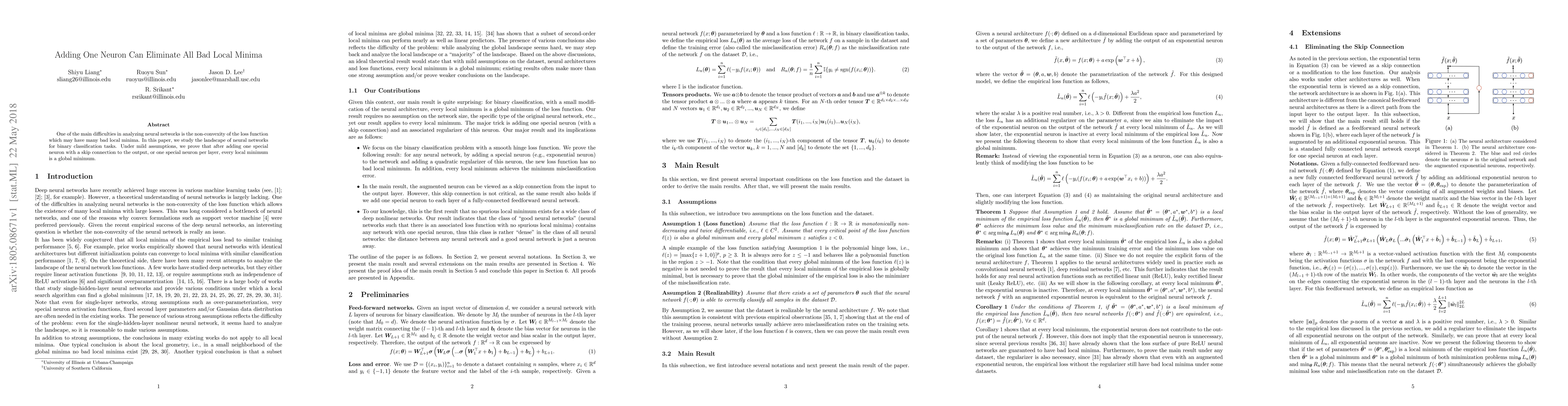 The paper analyzes the landscape of neural networks for binary classification tasks, proving that adding one special neuron with a skip connection to the output or one per layer ensures all local minima are global minima under mild assumptions.
