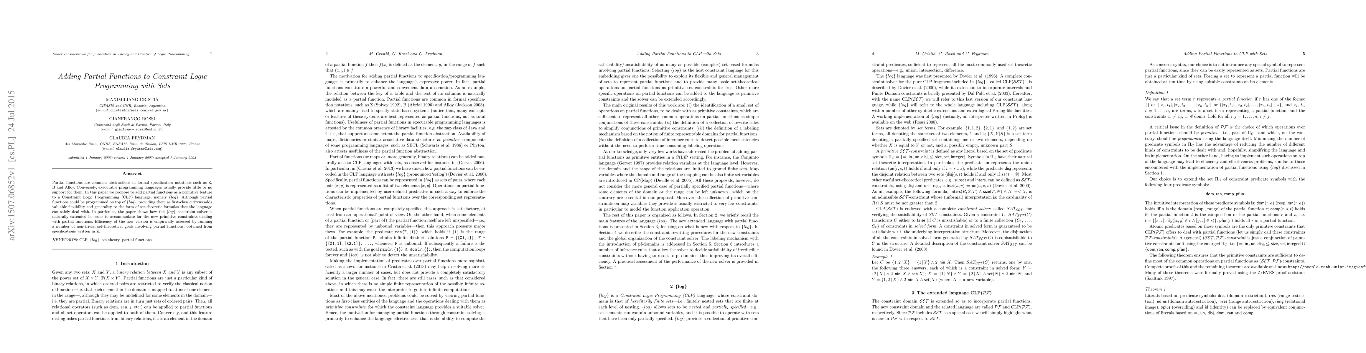 This paper proposes integrating partial functions as first-class features into a Constraint Logic Programming (CLP) language, {log}, enhancing its flexibility and generality. The authors demonstrate the extension of the {log} constraint solver to handle these new primitive constraints and evaluate the efficiency through practical set-theoretical examples from Z specifications.