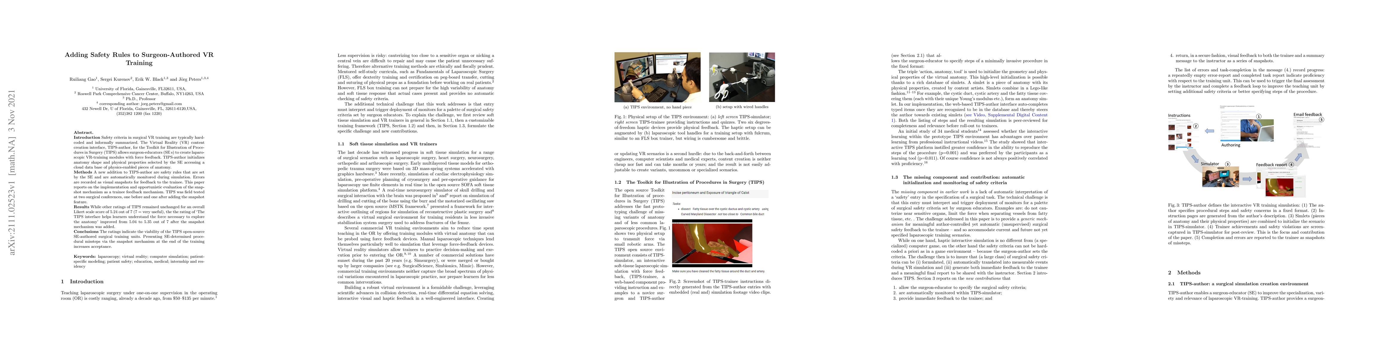Introduction: Safety criteria in surgical VR training are typically hard-coded and informally summarized. The Virtual Reality (VR) content creation interface, TIPS-author, for the Toolkit for Illustration of Procedures in Surgery (TIPS) allows surgeon-educators (SEs) to create laparoscopic VR-training modules with force feedback. TIPS-author initializes anatomy shape and physical properties selected by the SE accessing a cloud data base of physics-enabled pieces of anatomy. Methods: A new addition to TIPS-author are safety rules that are set by the SE and are automatically monitored during simulation. Errors are recorded as visual snapshots for feedback to the trainee. This paper reports on the implementation and opportunistic evaluation of the snap-shot mechanism as a trainee feedback mechanism. TIPS was field tested at two surgical conferences, one before and one after adding the snapshot feature. Results: While other ratings of TIPS remained unchanged for an overall Likert scale score of 5.24 out of 7 (7 equals very useful), the rating of the statement `The TIPS interface helps learners understand the force necessary to explore the anatomy' improved from 5.04 to 5.35 out of 7 after the snapshot mechanism was added. Conclusions: The ratings indicate the viability of the TIPS open-source2 E-authored surgical training units. Presenting SE-determined procedural missteps via the snapshot mechanism at the end of the training increases acceptance