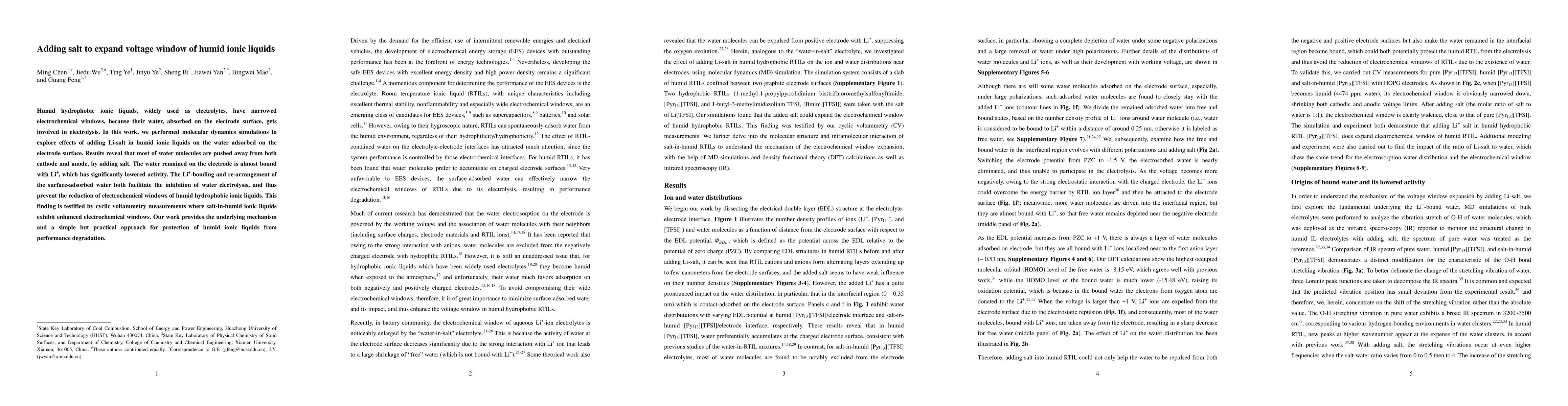 The paper presents a detailed molecular dynamics simulation study combined with DFT calculations and experimental cyclic voltammetry measurements to elucidate the mechanism by which Li-salt addition expands the electrochemical window of humid hydrophobic RTILs.