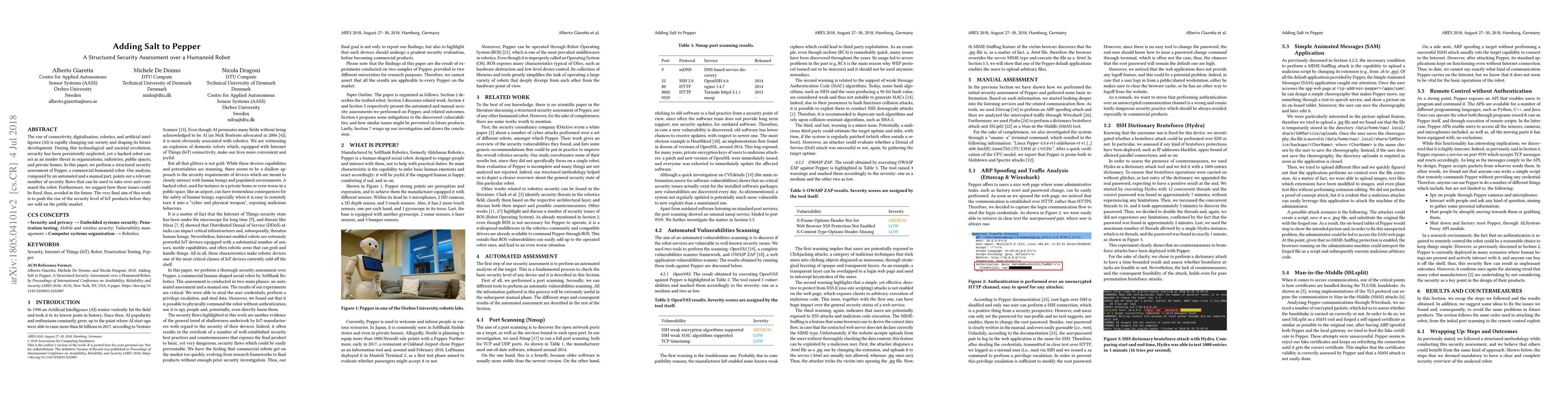 The rise of connectivity, digitalization, robotics, and artificial intelligence (AI) is rapidly changing our society and shaping its future development. During this technological and societal revolution, security has been persistently neglected, yet a hacked robot can act as an insider threat in organizations, industries, public spaces, and private homes. In this paper, we perform a structured security assessment of Pepper, a commercial humanoid robot. Our analysis, composed by an automated and a manual part, points out a relevant number of security flaws that can be used to take over and command the robot. Furthermore, we suggest how these issues could be fixed, thus, avoided in the future. The very final aim of this work is to push the rise of the security level of IoT products before they are sold on the public market.