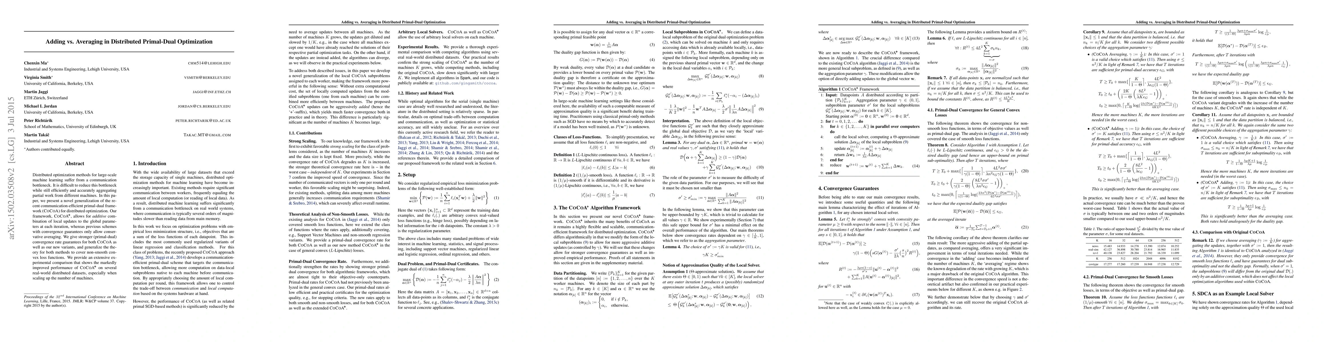 Distributed optimization methods for large-scale machine learning suffer from a communication bottleneck. It is difficult to reduce this bottleneck while still efficiently and accurately aggregating partial work from different machines. In this paper, we present a novel generalization of the recent communication-efficient primal-dual framework (CoCoA) for distributed optimization. Our framework, CoCoA+, allows for additive combination of local updates to the global parameters at each iteration, whereas previous schemes with convergence guarantees only allow conservative averaging. We give stronger (primal-dual) convergence rate guarantees for both CoCoA as well as our new variants, and generalize the theory for both methods to cover non-smooth convex loss functions. We provide an extensive experimental comparison that shows the markedly improved performance of CoCoA+ on several real-world distributed datasets, especially when scaling up the number of machines.