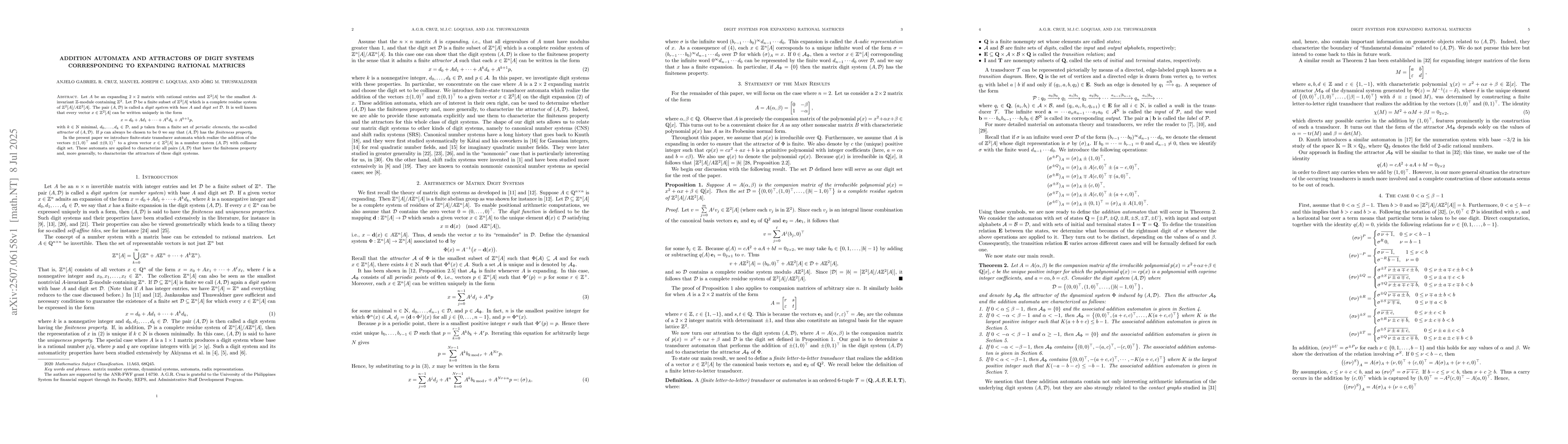Let $A$ be an expanding $2 \times 2$ matrix with rational entries and $\mathbb{Z}^2[A]$ be the smallest $A$-invariant $\mathbb{Z}$-module containing $\mathbb{Z}^2$. Let $\mathcal{D}$ be a finite subset of $\mathbb{Z}^2[A]$ which is a complete residue system of $\mathbb{Z}^2[A]/A\mathbb{Z}^2[A]$. The pair $(A,\mathcal{D})$ is called a {\em digit system} with {\em base} $A$ and {\em digit set} $\mathcal{D}$. It is well known that every vector $x \in \mathbb{Z}^2[A]$ can be written uniquely in the form \[ x = d_0 + Ad_1 + \cdots + A^kd_k + A^{k+1}p, \] with $k\in \mathbb{N}$ minimal, $d_0,\dots,d_k \in \mathcal{D}$, and $p$ taken from a finite set of {\em periodic elements}, the so-called {\em attractor} of $(A,\mathcal{D})$. If $p$ can always be chosen to be $0$ we say that $(A,\mathcal{D})$ has the {\em finiteness property}. In the present paper we introduce finite-state transducer automata which realize the addition of the vectors $\pm(1,0)^\top$ and $\pm(0,1)^\top$ to a given vector $x\in \mathbb{Z}^2[A]$ in a number system $(A,\mathcal{D})$ with collinear digit set. These automata are applied to characterize all pairs $(A,\mathcal{D})$ that have the finiteness property and, more generally, to characterize the attractors of these digit systems.