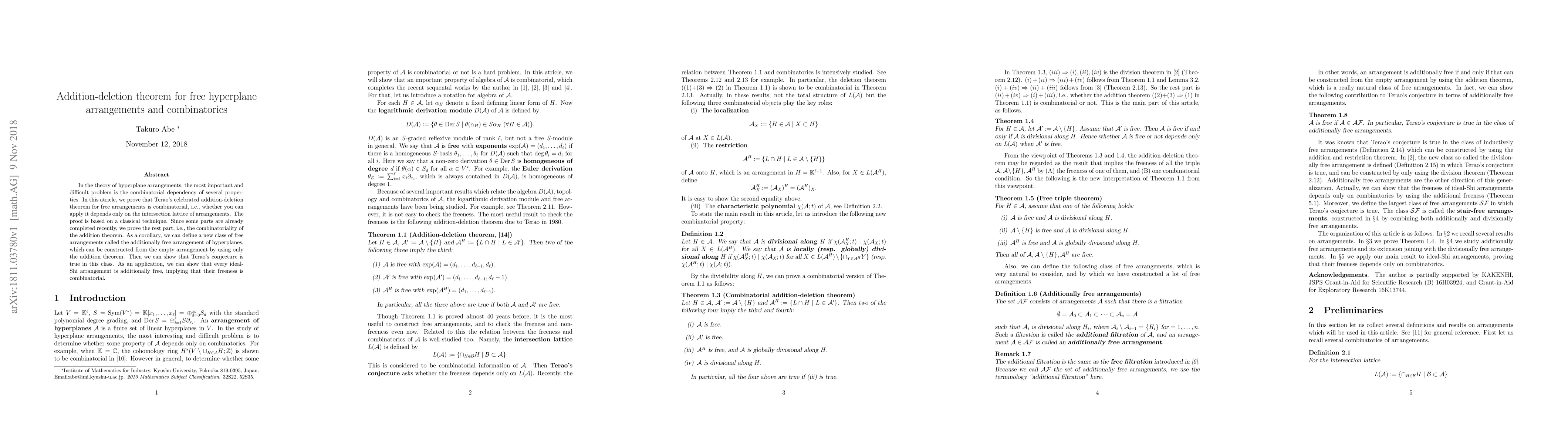 This paper proves that Terao's addition-deletion theorem for free hyperplane arrangements is combinatorial, depending only on the intersection lattice. It introduces a new class of free arrangements called additionally free arrangements, confirming Terao's conjecture for this class and showing that ideal-Shi arrangements are additionally free, establishing their combinatorial freeness.