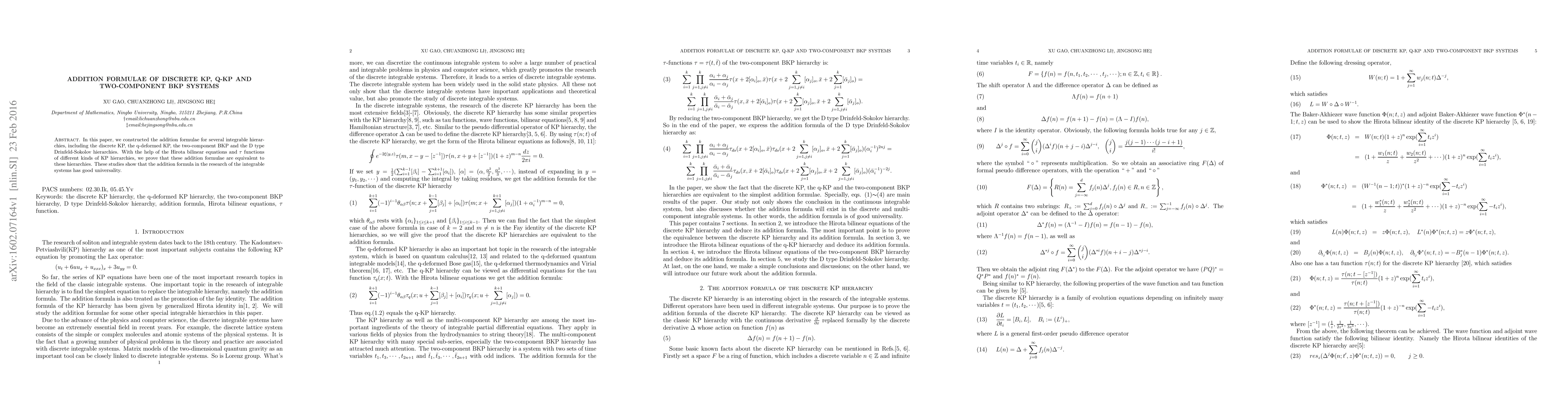 This paper constructs addition formulae for the discrete KP, q-KP, two-component BKP, and D type Drinfeld-Sokolov hierarchies using Hirota bilinear equations and $\tau$ functions, demonstrating their equivalence and highlighting the universal applicability of these formulae in integrable systems research.