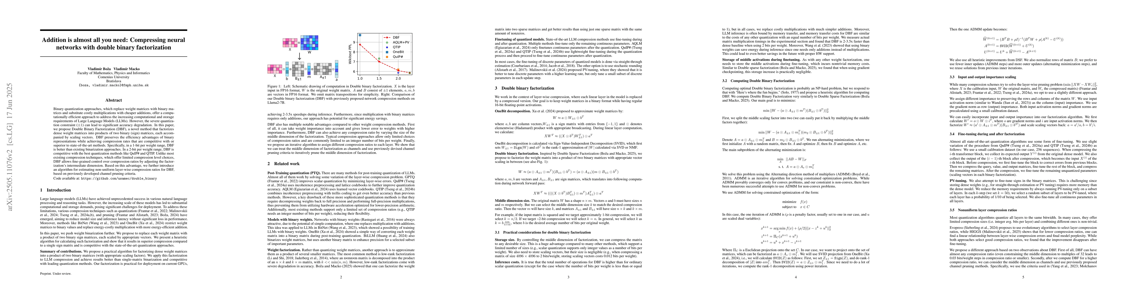 This research introduces Double Binary Factorization (DBF), a method that enhances binary quantization for neural networks, preserving computational efficiency while achieving high compression rates. DBF outperforms existing binarization approaches in low-bit settings and offers fine-grained control over compression ratios, making it a flexible solution for Large Language Models.