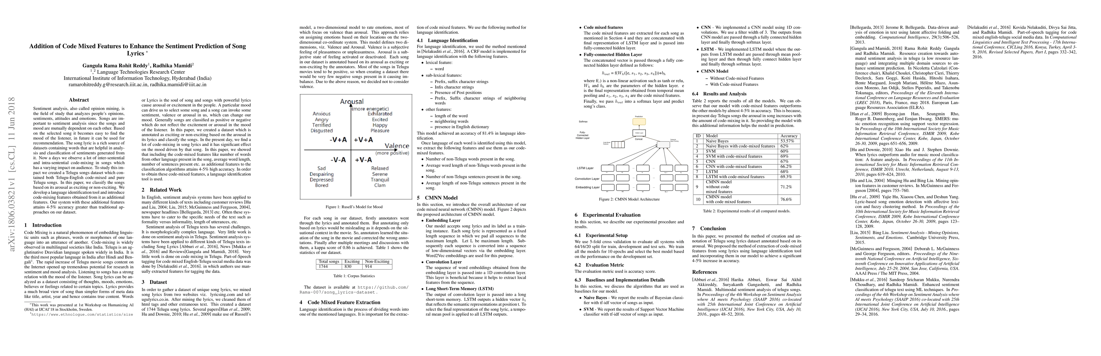 Sentiment analysis, also called opinion mining, is the field of study that analyzes people's opinions,sentiments, attitudes and emotions. Songs are important to sentiment analysis since the songs and mood are mutually dependent on each other. Based on the selected song it becomes easy to find the mood of the listener, in future it can be used for recommendation. The song lyric is a rich source of datasets containing words that are helpful in analysis and classification of sentiments generated from it. Now a days we observe a lot of inter-sentential and intra-sentential code-mixing in songs which has a varying impact on audience. To study this impact we created a Telugu songs dataset which contained both Telugu-English code-mixed and pure Telugu songs. In this paper, we classify the songs based on its arousal as exciting or non-exciting. We develop a language identification tool and introduce code-mixing features obtained from it as additional features. Our system with these additional features attains 4-5% accuracy greater than traditional approaches on our dataset.
