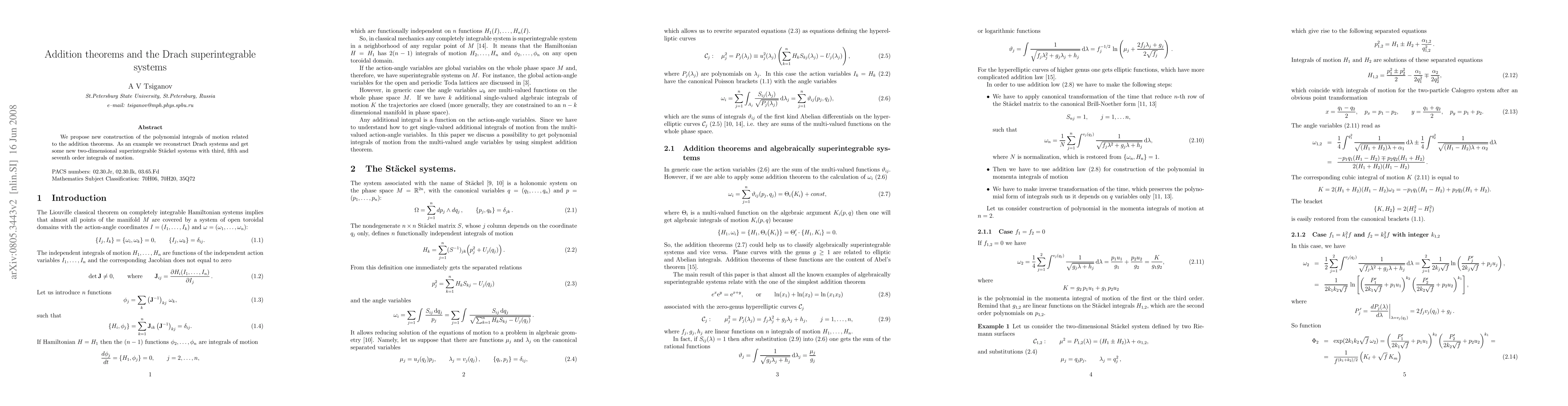 This paper introduces new polynomial integrals of motion derived from addition theorems, specifically reconstructing Drach systems and discovering new two-dimensional superintegrable Stackel systems with third, fifth, and seventh-order integrals of motion.