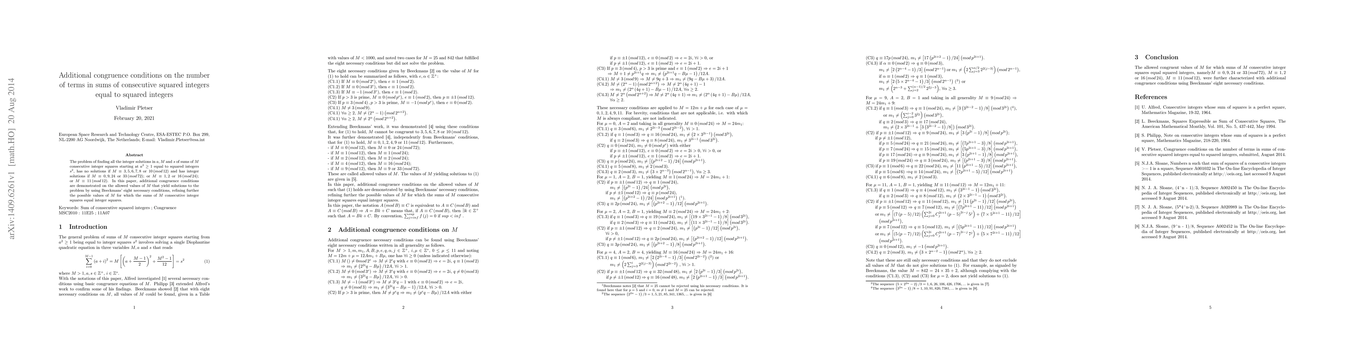 Researchers found additional conditions for sums of M consecutive integer squares to equal squared integers, narrowing down allowed values of M that yield solutions.