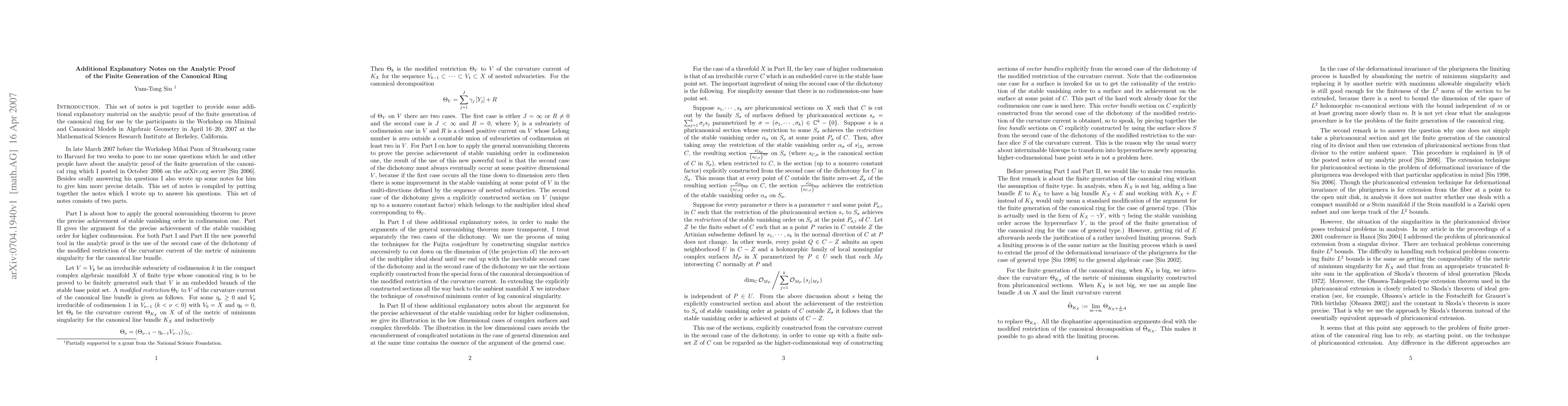 This set of notes provides some additional explanatory material on the analytic proof of the finite generation of the canonical ring for a compact complex algebraic manifold of general type.