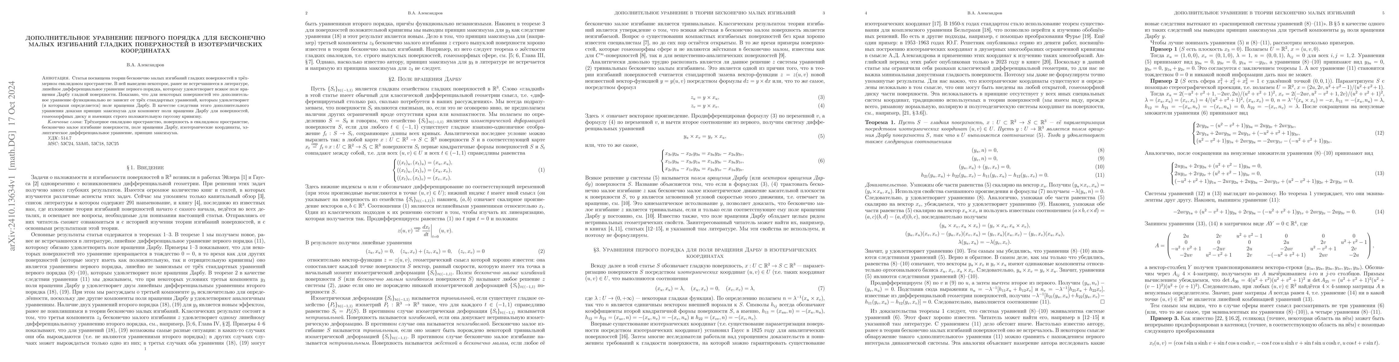 The paper derives a new first-order differential equation for infinitesimal bendings of smooth surfaces in Euclidean 3-space, showing it is independent of existing equations and proving a maximum principle for certain surfaces with positive Gaussian curvature.
