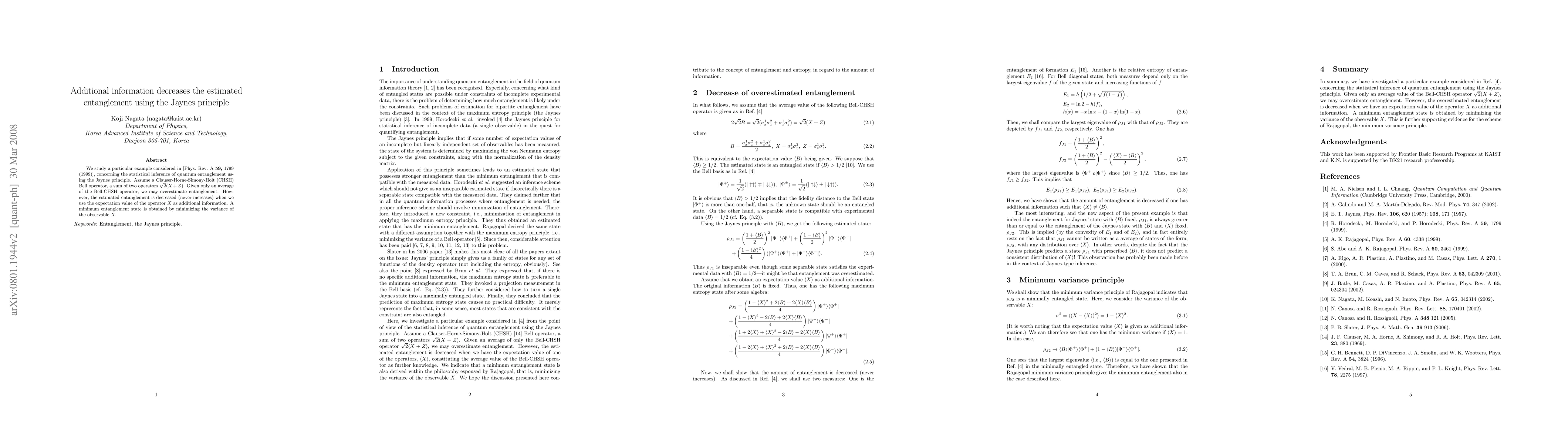 The paper demonstrates that incorporating additional information (expectation value of operator X) reduces overestimated entanglement in the Jaynes principle-based inference, and shows that minimizing variance of observable X yields a minimally entangled state.