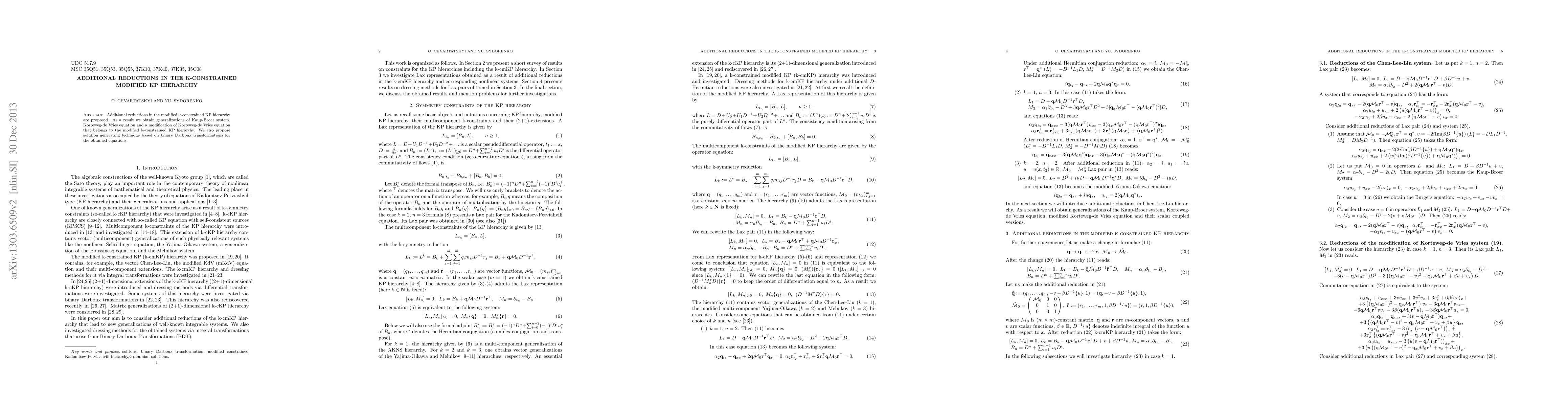 This paper proposes new reductions in the k-constrained modified KP hierarchy, leading to generalizations of the Kaup-Broer system, the Korteweg-de Vries equation, and a modified version of the latter. It also introduces a solution generating technique using binary Darboux transformations for these derived equations.
