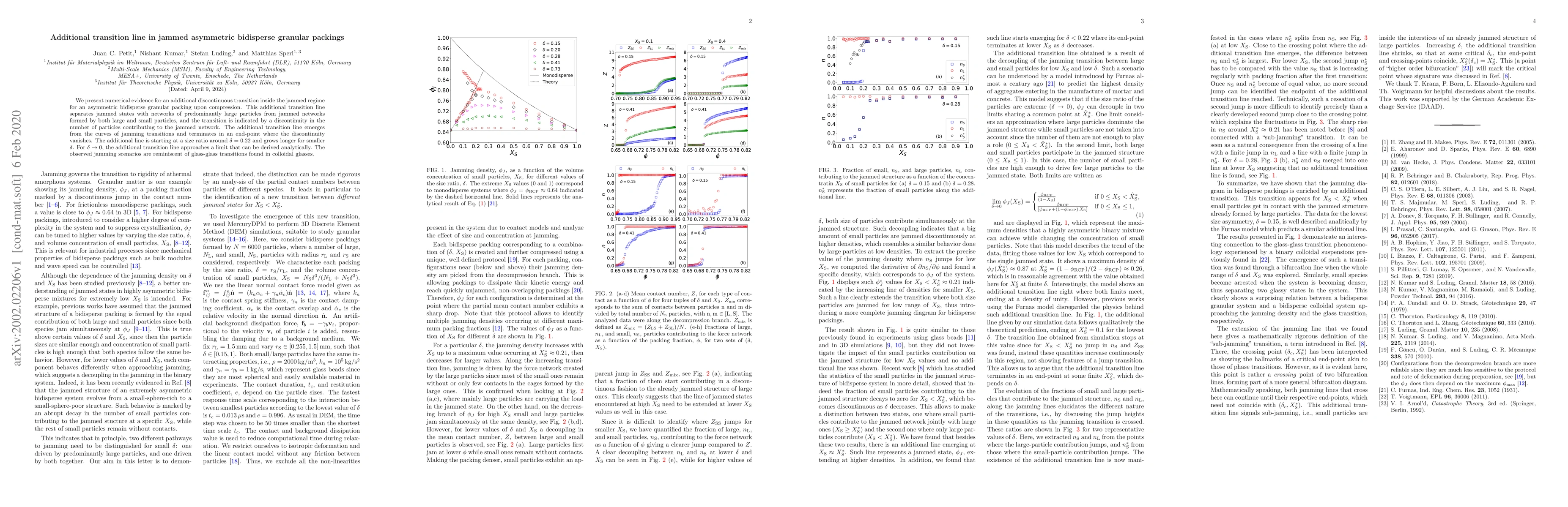 This study reveals a new discontinuous transition within the jammed state of asymmetric bidisperse granular packings, distinguishing networks dominated by large particles from those involving both large and small particles. The transition line emerges at a size ratio of approximately $\delta = 0.22$ and extends further for smaller ratios, approaching an analytically derived limit as $\delta \to 0$.