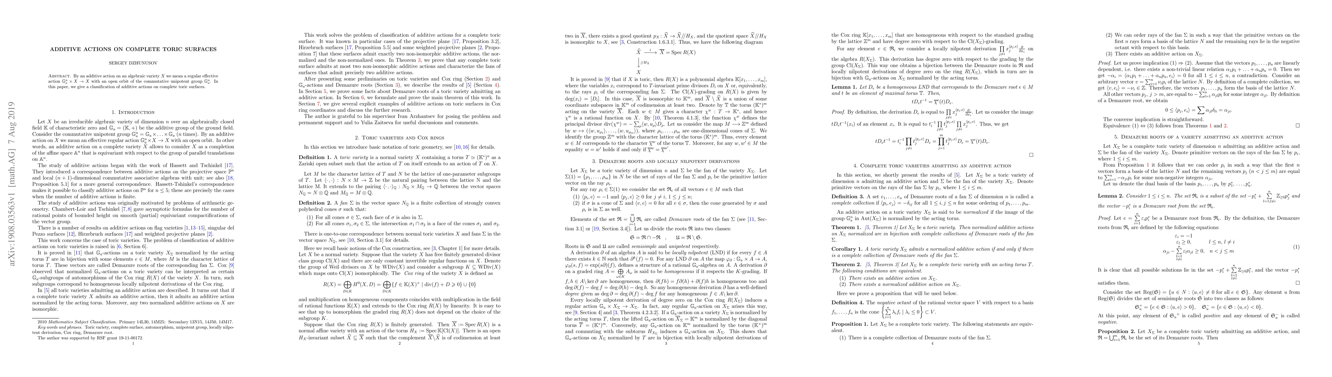 This paper classifies additive actions on complete toric surfaces, identifying regular effective actions of the commutative unipotent group $\mathbb{G}_a^n$ that possess an open orbit.