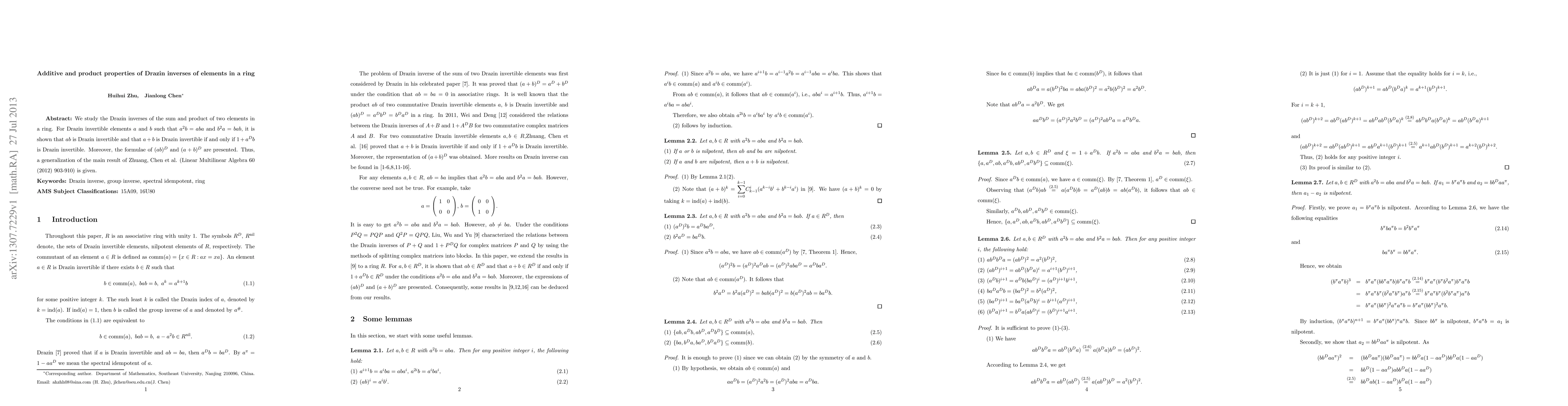 A ring study shows that Drazin inverses of product and sum can be calculated using specific conditions, providing a generalization for Drazin invertible elements.
