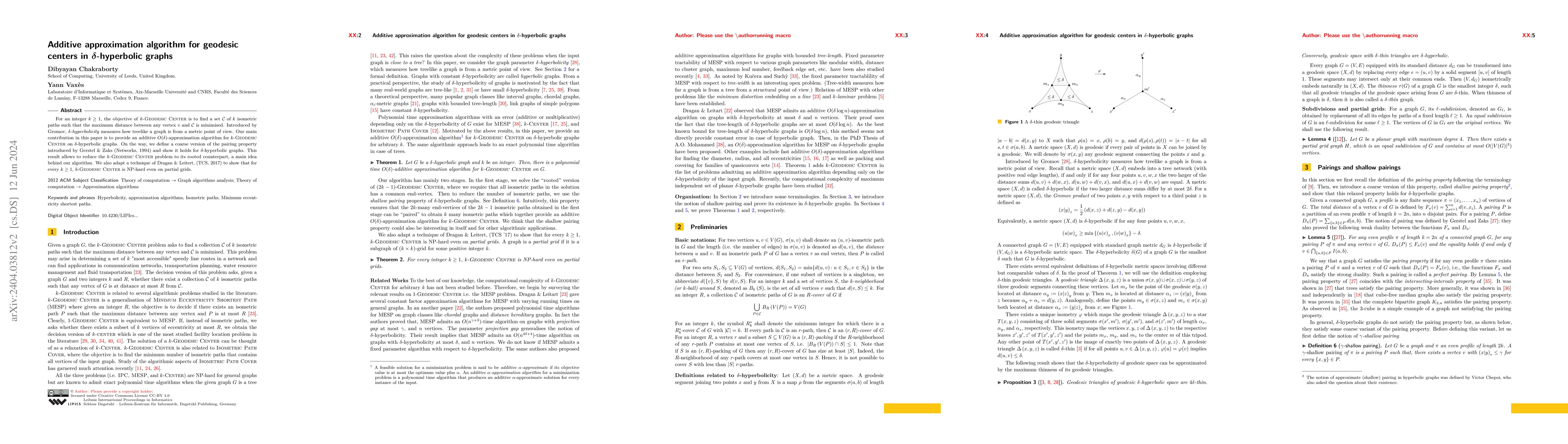 For an integer $k\geq 1$, the objective of \textsc{$k$-Geodesic Center} is to find a set $\mathcal{C}$ of $k$ isometric paths such that the maximum distance between any vertex $v$ and $\mathcal{C}$ is minimised. Introduced by Gromov, \emph{$\delta$-hyperbolicity} measures how treelike a graph is from a metric point of view. Our main contribution in this paper is to provide an additive $O(\delta)$-approximation algorithm for \textsc{$k$-Geodesic Center} on $\delta$-hyperbolic graphs. On the way, we define a coarse version of the pairing property introduced by Gerstel \& Zaks (Networks, 1994) and show it holds for $\delta$-hyperbolic graphs. This result allows to reduce the \textsc{$k$-Geodesic Center} problem to its rooted counterpart, a main idea behind our algorithm. We also adapt a technique of Dragan \& Leitert, (TCS, 2017) to show that for every $k\geq 1$, $k$-\textsc{Geodesic Center} is NP-hard even on partial grids.
