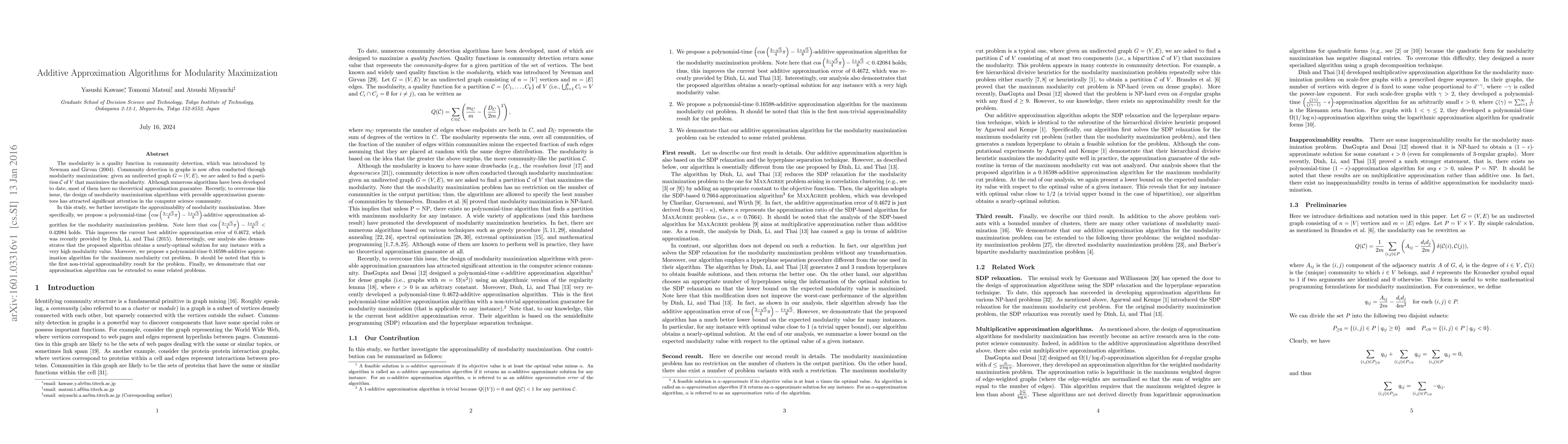 This paper proposes improved additive approximation algorithms for modularity maximization and the maximum modularity cut problem, achieving better approximation ratios than previous methods. The study introduces a new algorithm with a lower additive error, enhancing the theoretical understanding of these community detection problems.