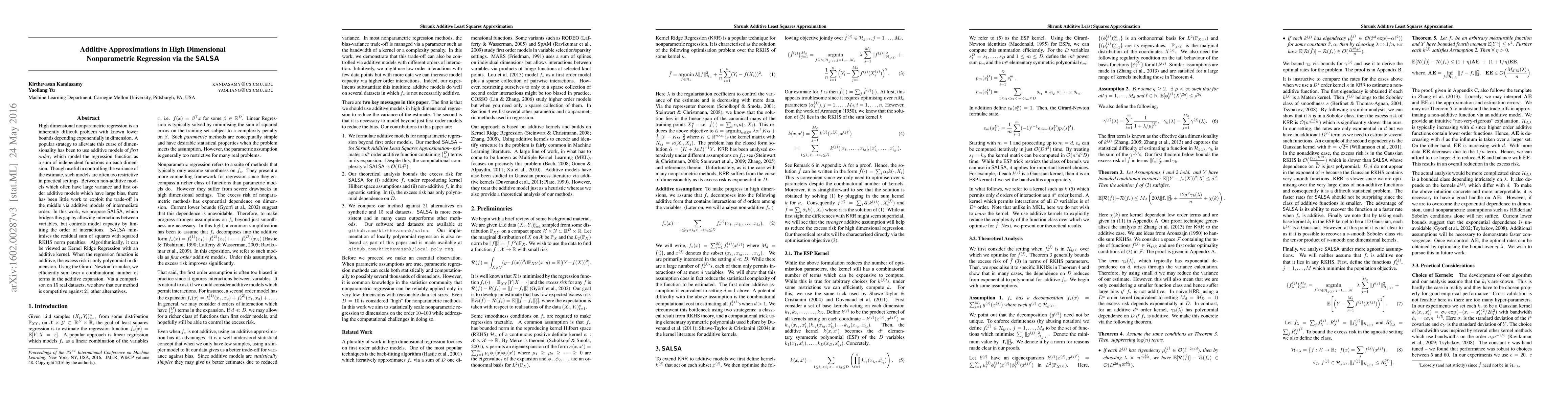 This paper proposes SALSA, an additive model for high-dimensional nonparametric regression that allows interactions between variables while controlling model capacity by limiting interaction order. SALSA minimizes residual sum of squares with squared RKHS norm penalties and is shown to be competitive against 21 other methods on 15 real datasets.