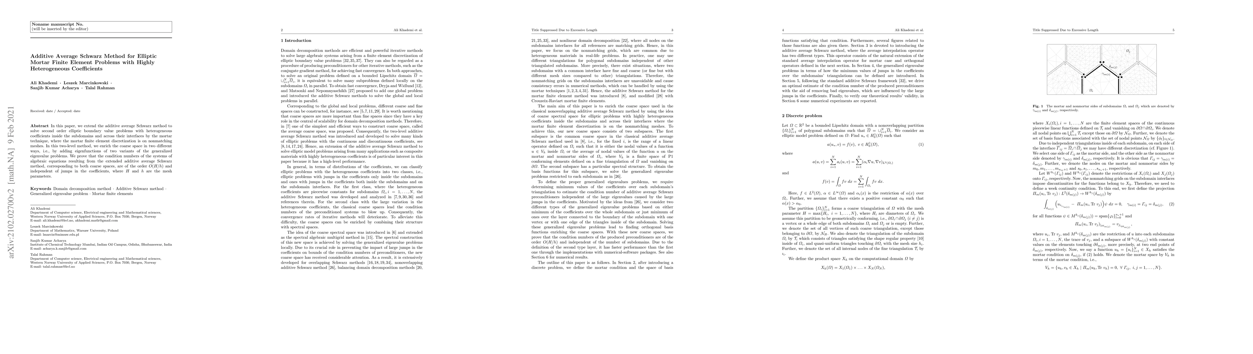 This paper extends the additive average Schwarz method to solve elliptic boundary value problems with heterogeneous coefficients using a mortar finite element technique on nonmatching meshes. The method enriches the coarse space with eigenfunctions from generalized eigenvalue problems, ensuring condition numbers of O(H/h) independent of coefficient jumps.