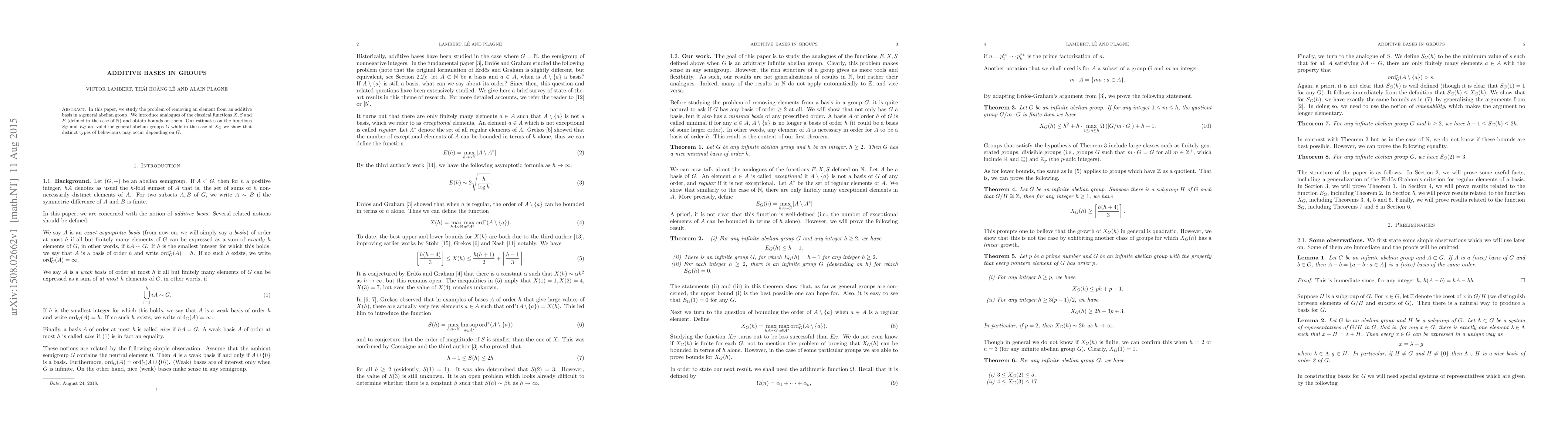 In this paper, we study the problem of removing an element from an additive basis in a general abelian group. We introduce analogues of the classical functions $X$, $S$ and $E$ (defined in the case of the integers) and obtain bounds on them. Our estimates on the functions $S_G$ and $E_G$ are valid for general abelian groups $G$ while in the case of $X_G$ we show that distinct types of behaviours may occur depending on the group $G$.