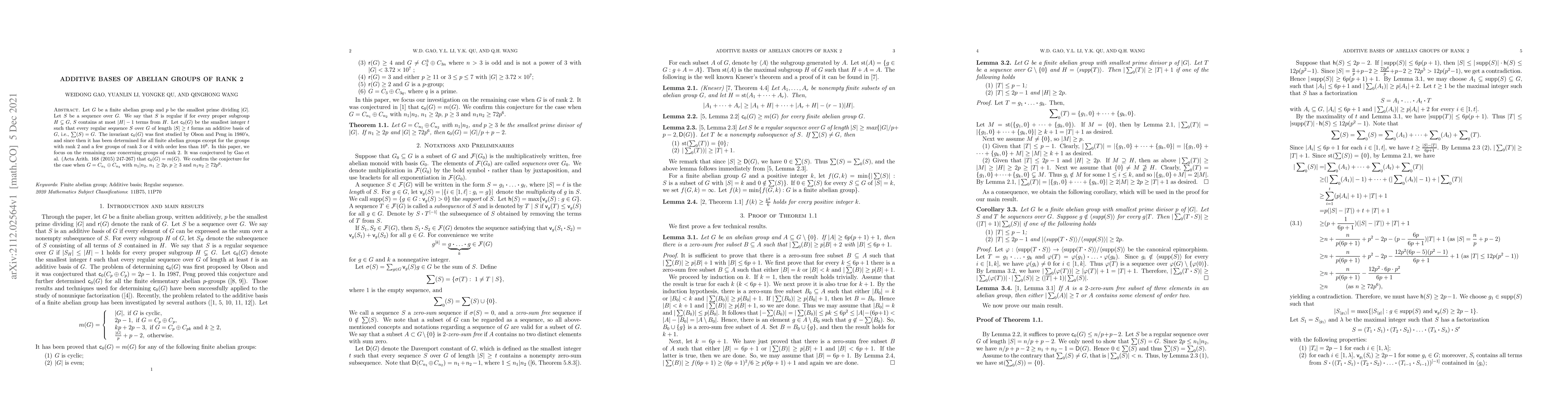 This paper investigates additive bases for finite abelian groups of rank 2, confirming a conjecture by Gao et al. that the smallest integer $t$ ensuring every regular sequence of length $t$ forms an additive basis equals the minimum number of generators $m(G)$ for specific groups where $n_1|n_2$, $n_1\geq 2p$, $p\geq 3$, and $n_1n_2\geq 72p^6$.