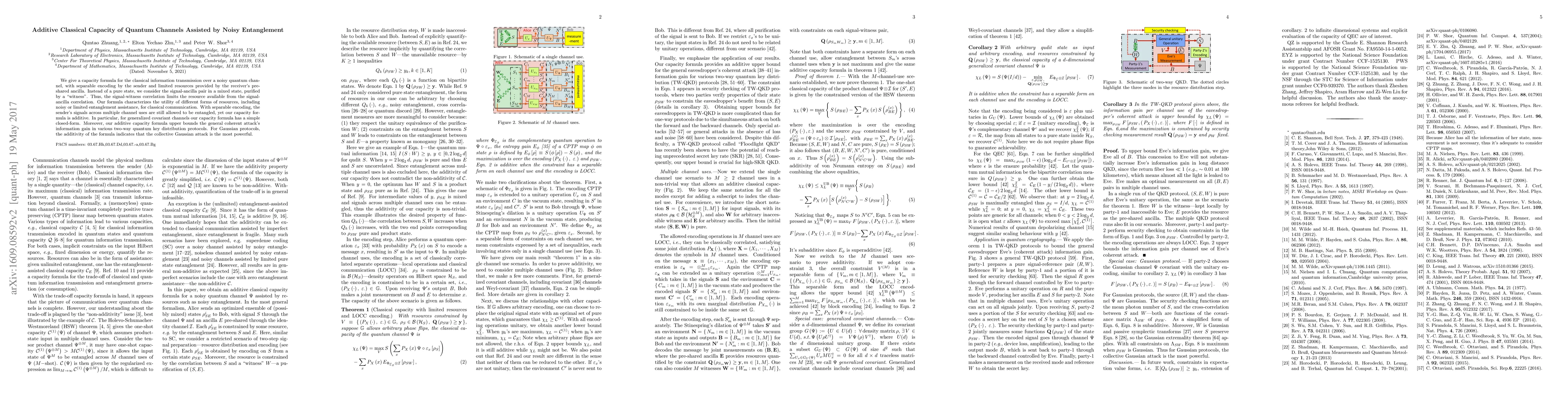 This paper presents an additive capacity formula for classical information transmission over noisy quantum channels, considering separable encoding and limited resources from the receiver's pre-shared ancilla. The formula characterizes the utility of noisy or limited entanglement assistance, providing a closed-form for generalized covariant channels and indicating that the collective Gaussian attack is the most powerful in Gaussian protocols.