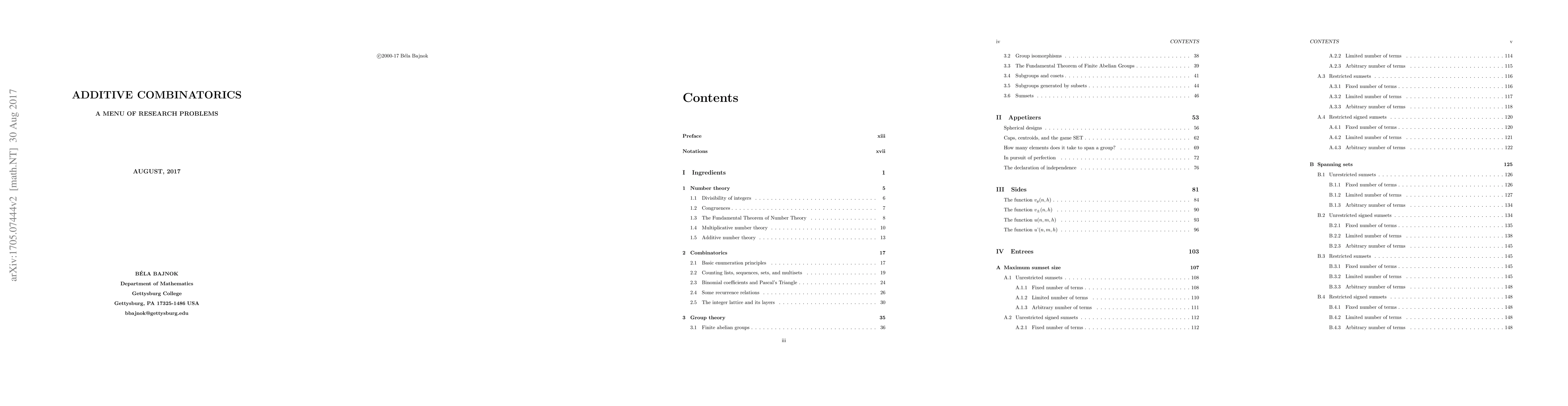 This paper presents a collection of 300 open research questions in additive combinatorics, providing a menu of problems for students and researchers to explore. The author aims to keep the material current through feedback and updates, making it a valuable resource for those interested in this field.