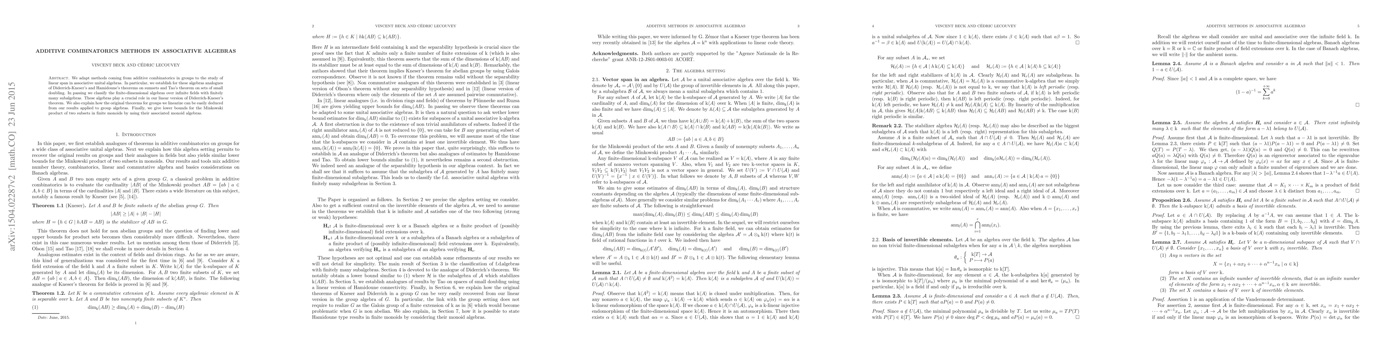 This paper adapts additive combinatorics methods from groups to associative unital algebras, establishing analogues of key theorems and classifying finite-dimensional algebras over infinite fields with finitely many subalgebras. It also provides lower bounds for the Minkowski product in finite monoids via their monoid algebras.