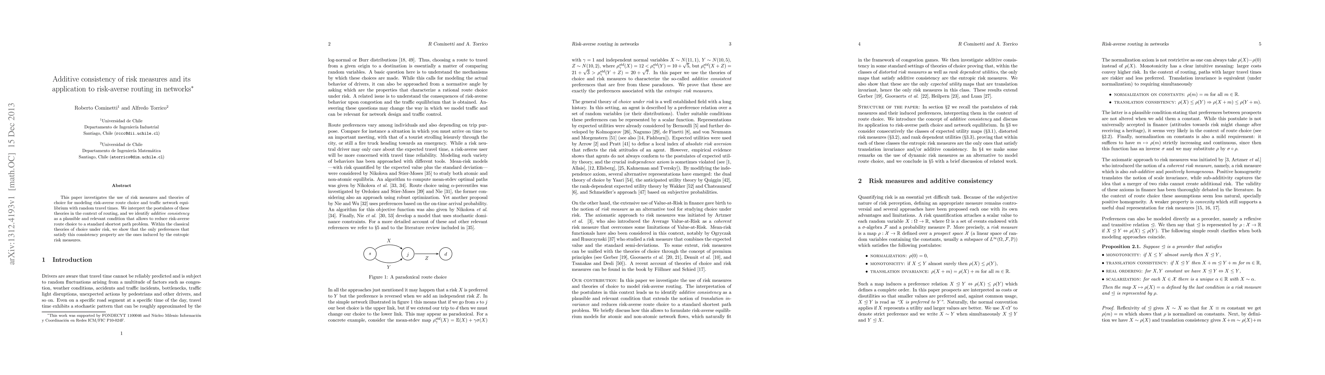 This paper investigates the use of risk measures and theories of choice for modeling risk-averse route choice and traffic network equilibrium with random travel times. We interpret the postulates of these theories in the context of routing, and we identify additive consistency as a plausible and relevant condition that allows to reduce risk-averse route choice to a standard shortest path problem. Within the classical theories of choice under risk, we show that the only preferences that satisfy this consistency property are the ones induced by the entropic risk measures.